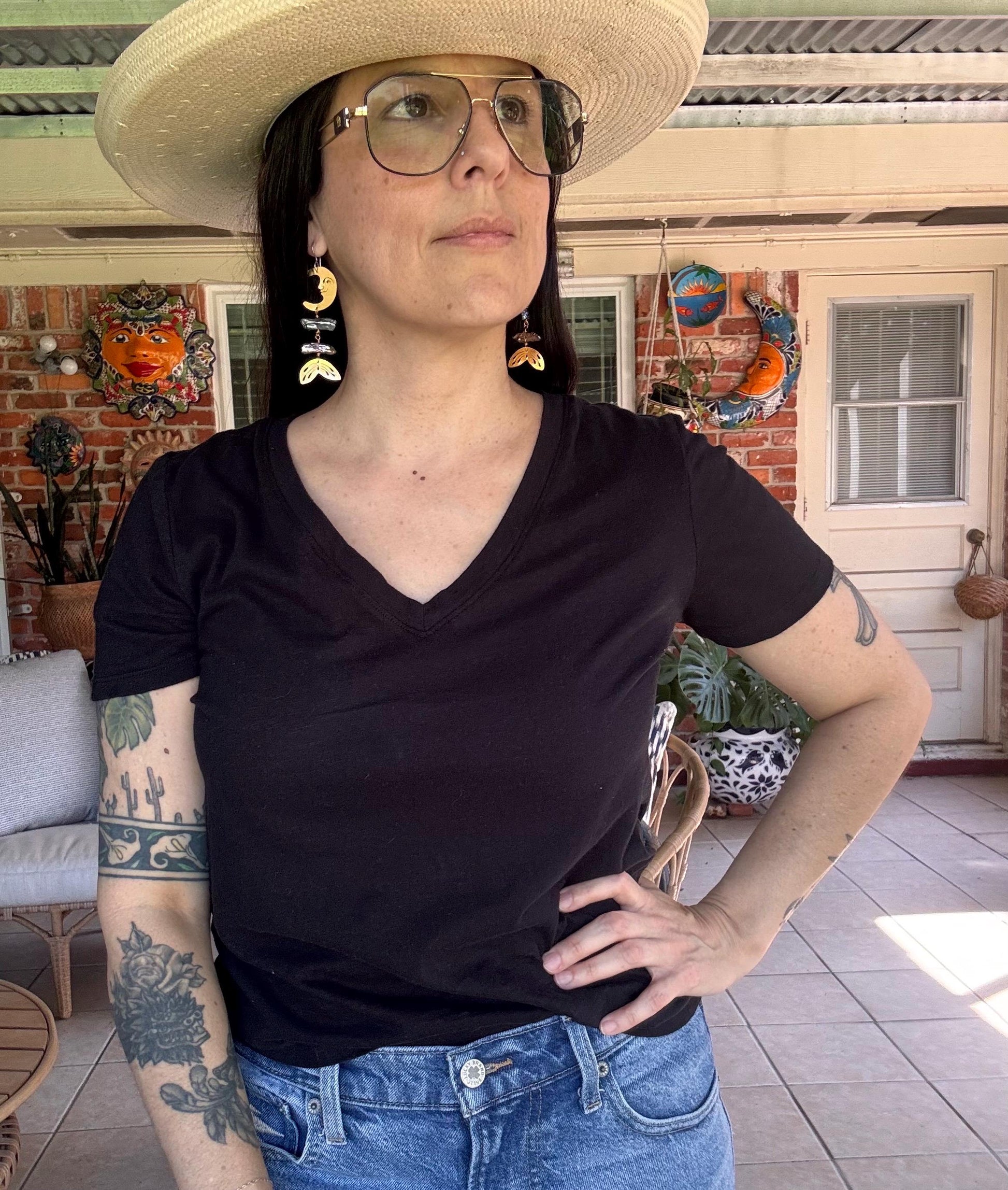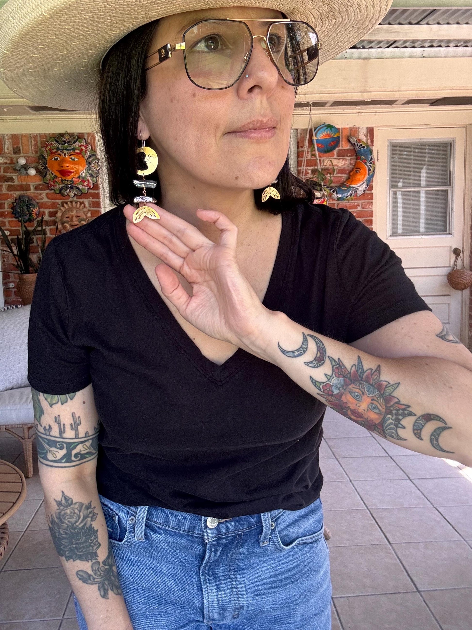 These playful Brass Lunar Pearl Rib Tide Earrings combine a crescent moon silhouette with shimmering Biwa pearls, evoking a magical mermaid vibe. Hand-cut brass adds a unique, artisanal touch that catches the light beautifully, while the delicate curve mirrors ocean tides. Perfect for adding a whimsical sparkle to any outfit, these earrings celebrate the mysterious charm of the moon and sea.