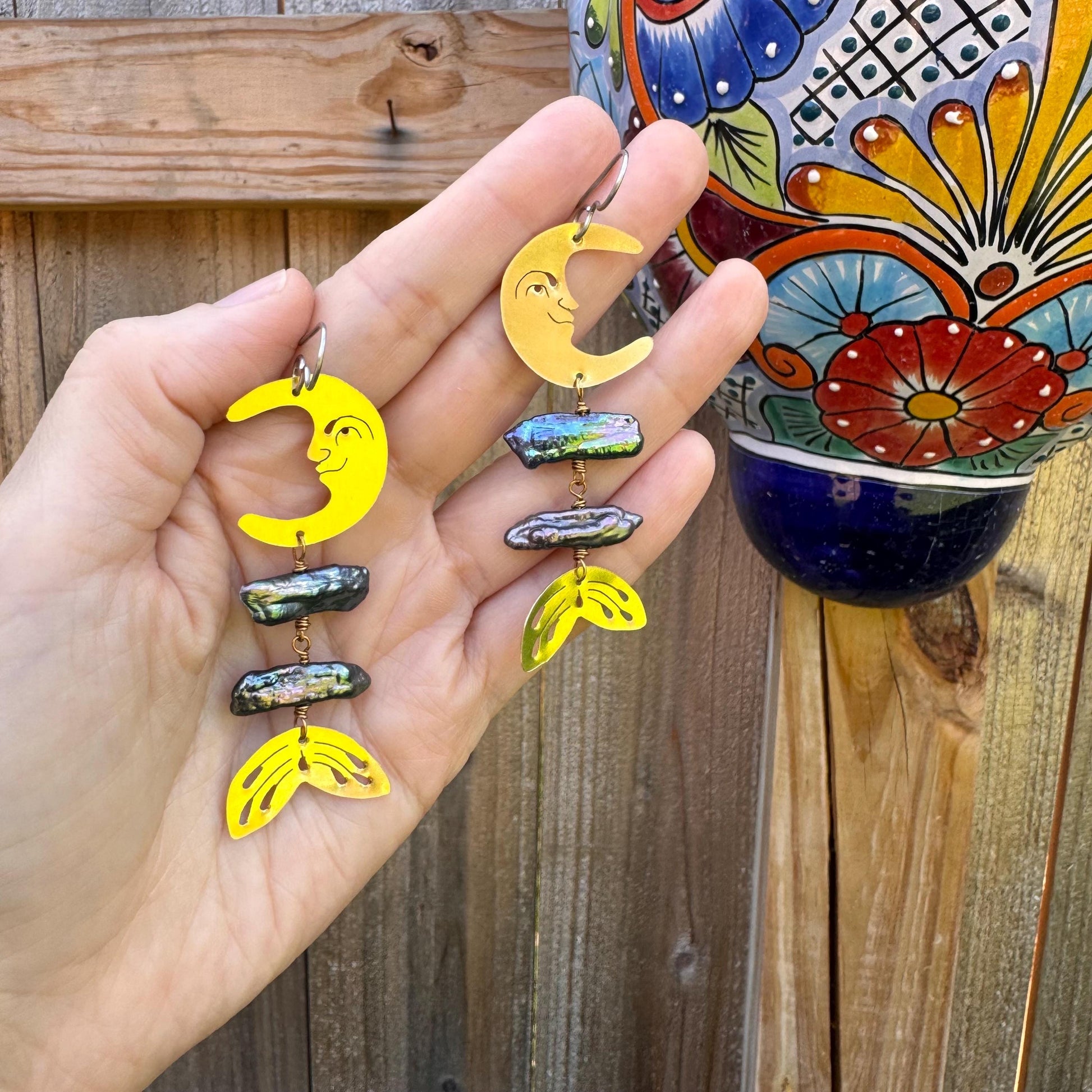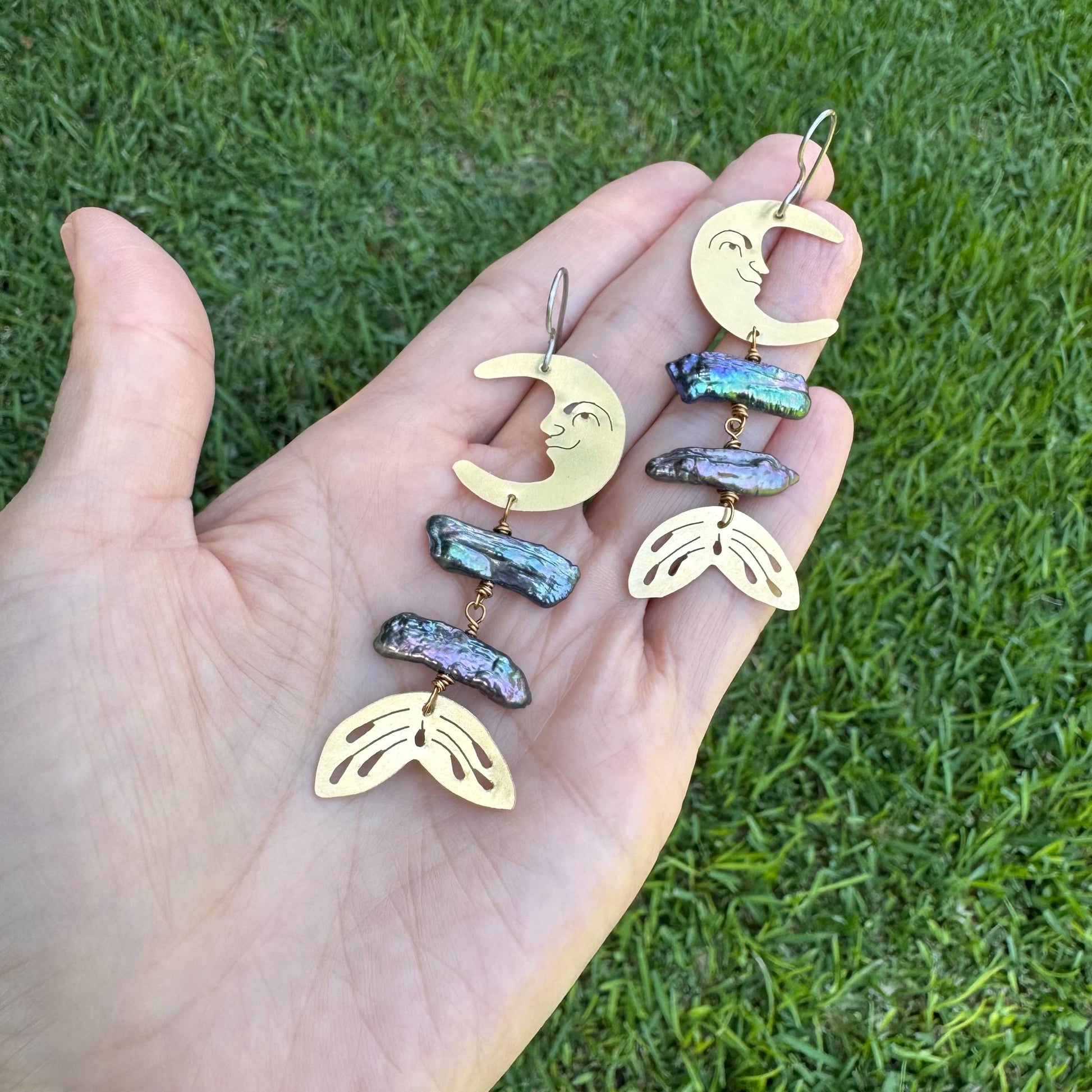-hand drawn, cut and hammered crescent moon heads and fins