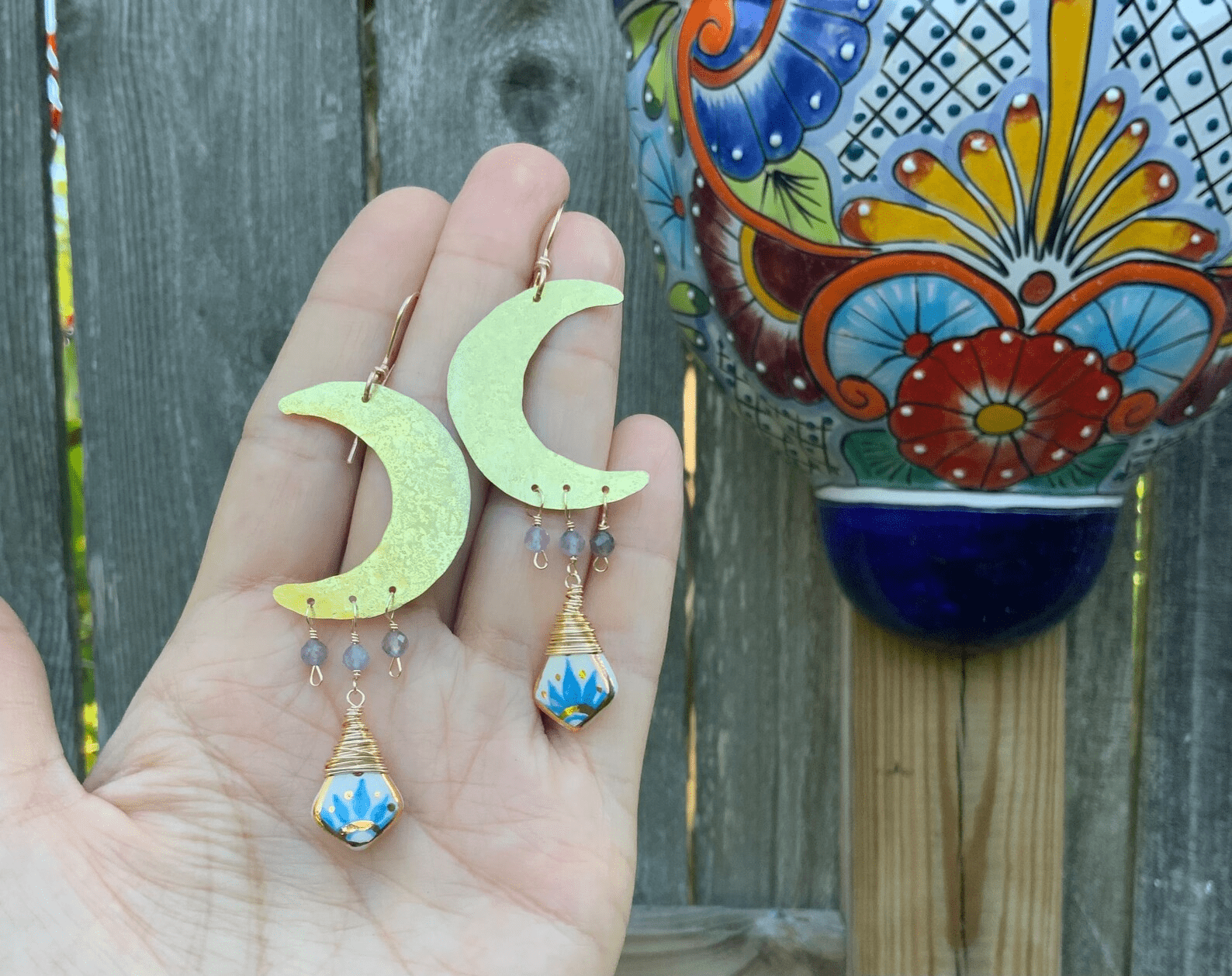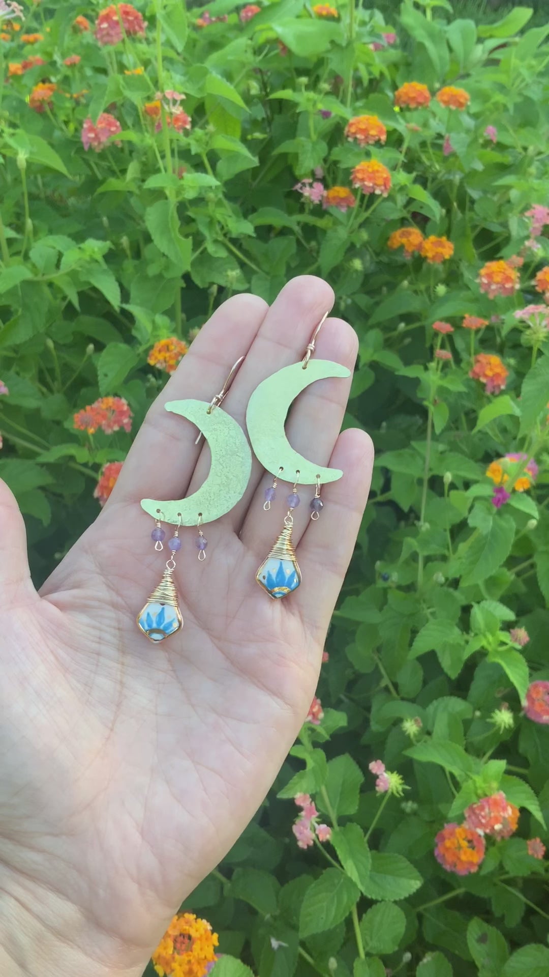Upgrade your style with these celestial-inspired earrings! Made with brass crescents, amethyst beads, and folk art ceramic beads, these earrings add a touch of magic through their moon-kissed design. Perfect for your night time look! π