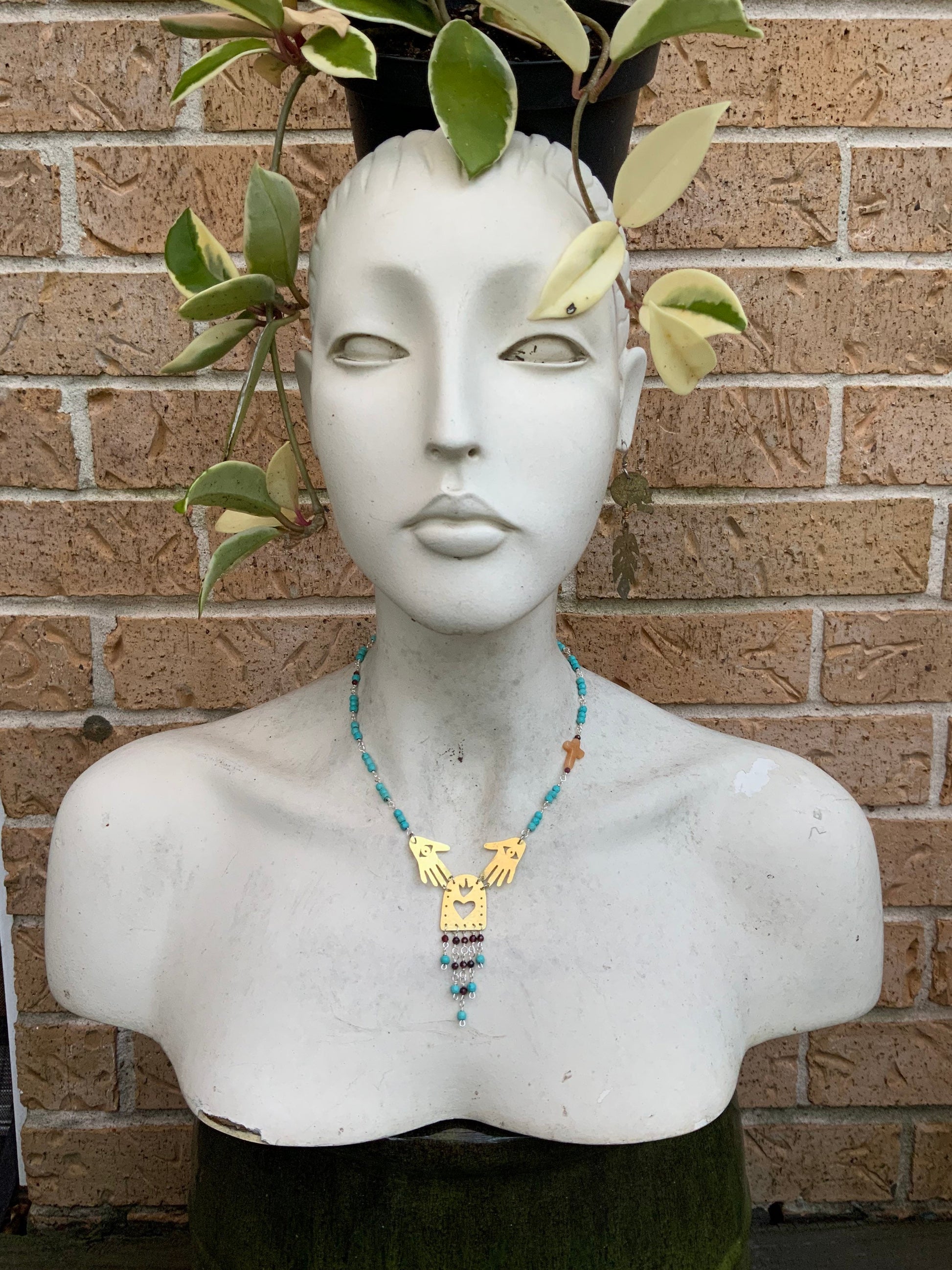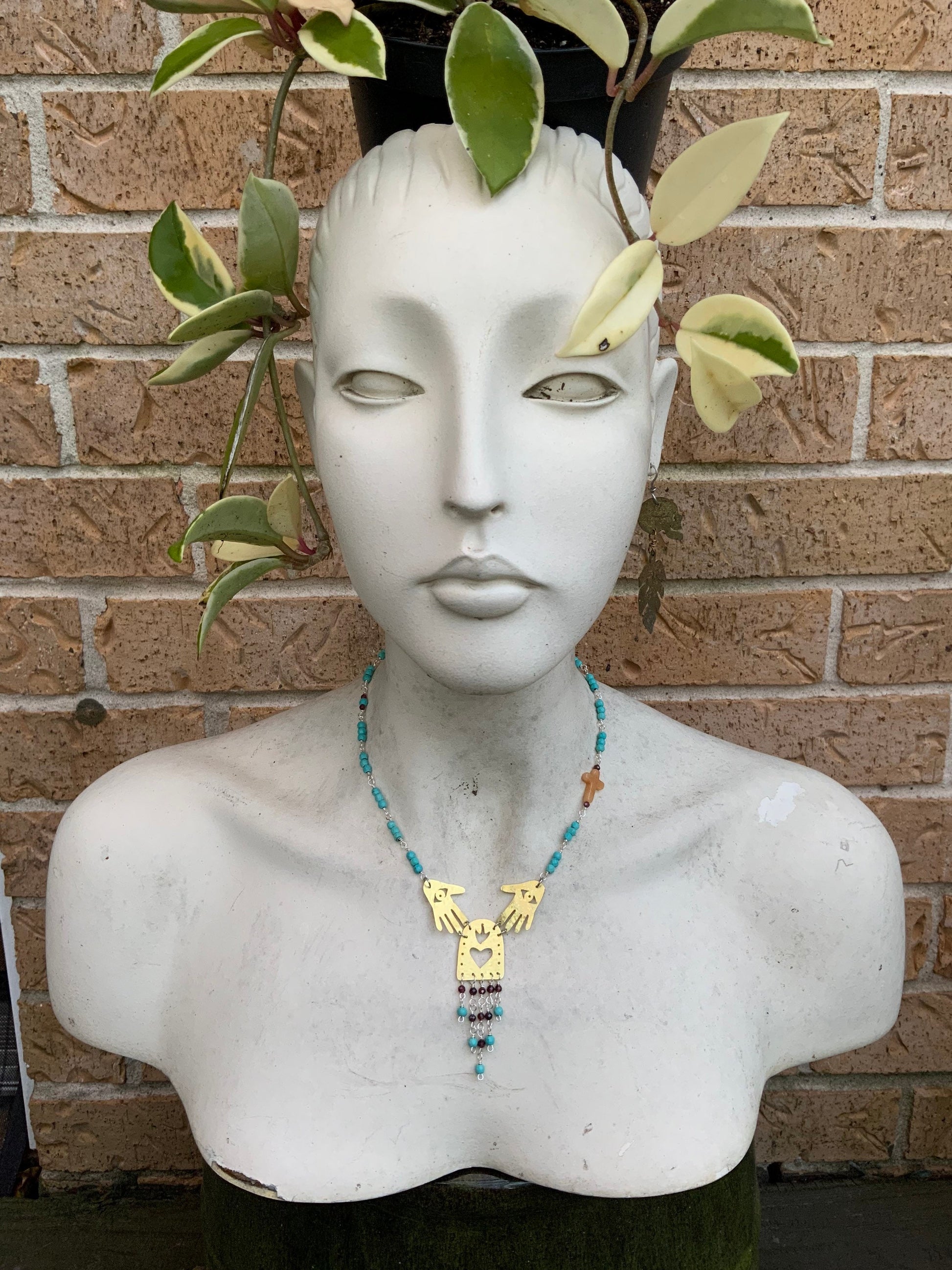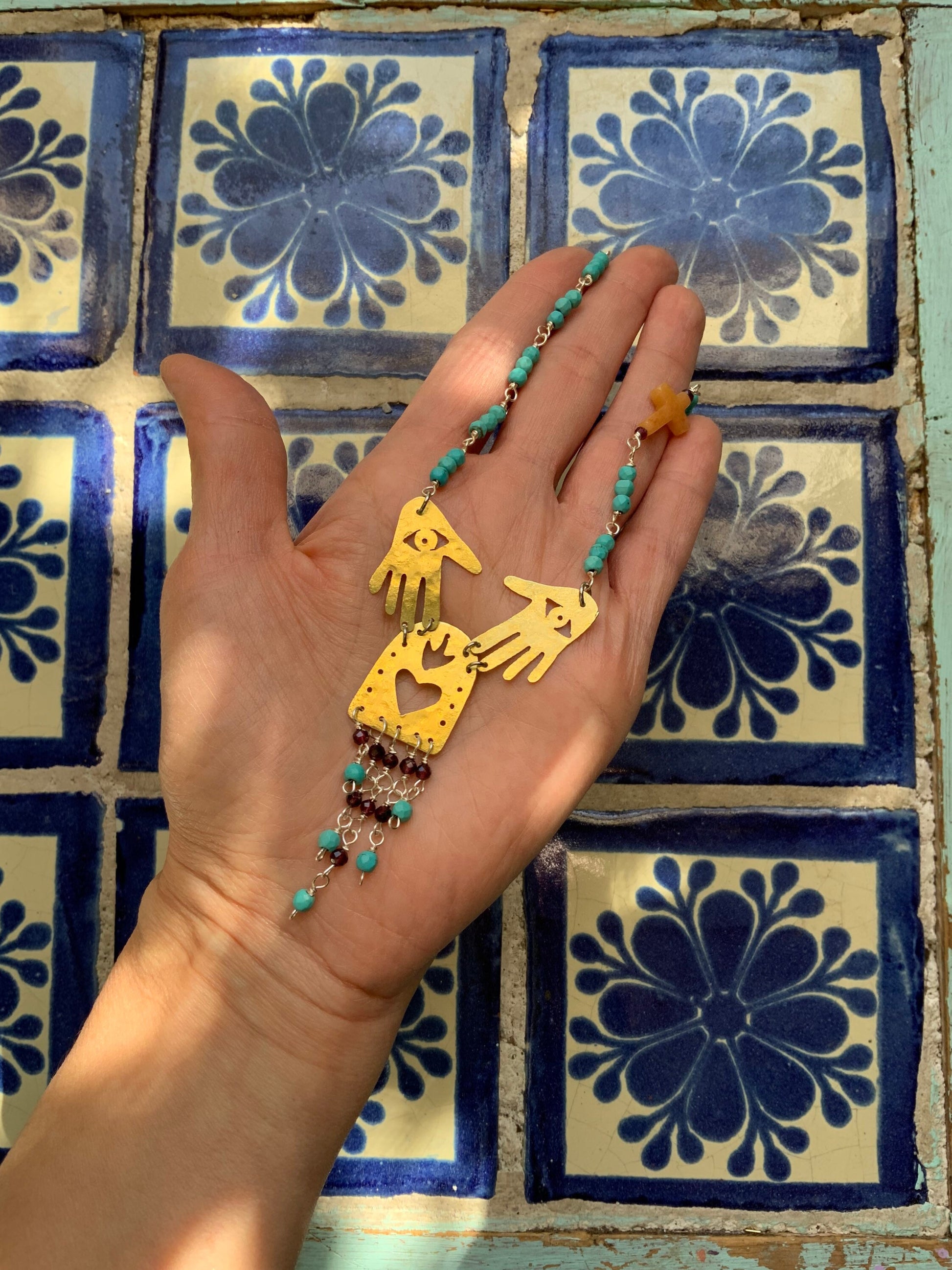This playful brass sacred heart necklace channels Mexican folk art vibes with a stunning garnet fringe that catches the light beautifully. Perfect for those who celebrate spirituality with style, it's a conversation starter that blends devotion with a touch of whimsy. Let your spiritual side shine with this charming, handcrafted piece that honors tradition while keeping things fun and fabulous.
