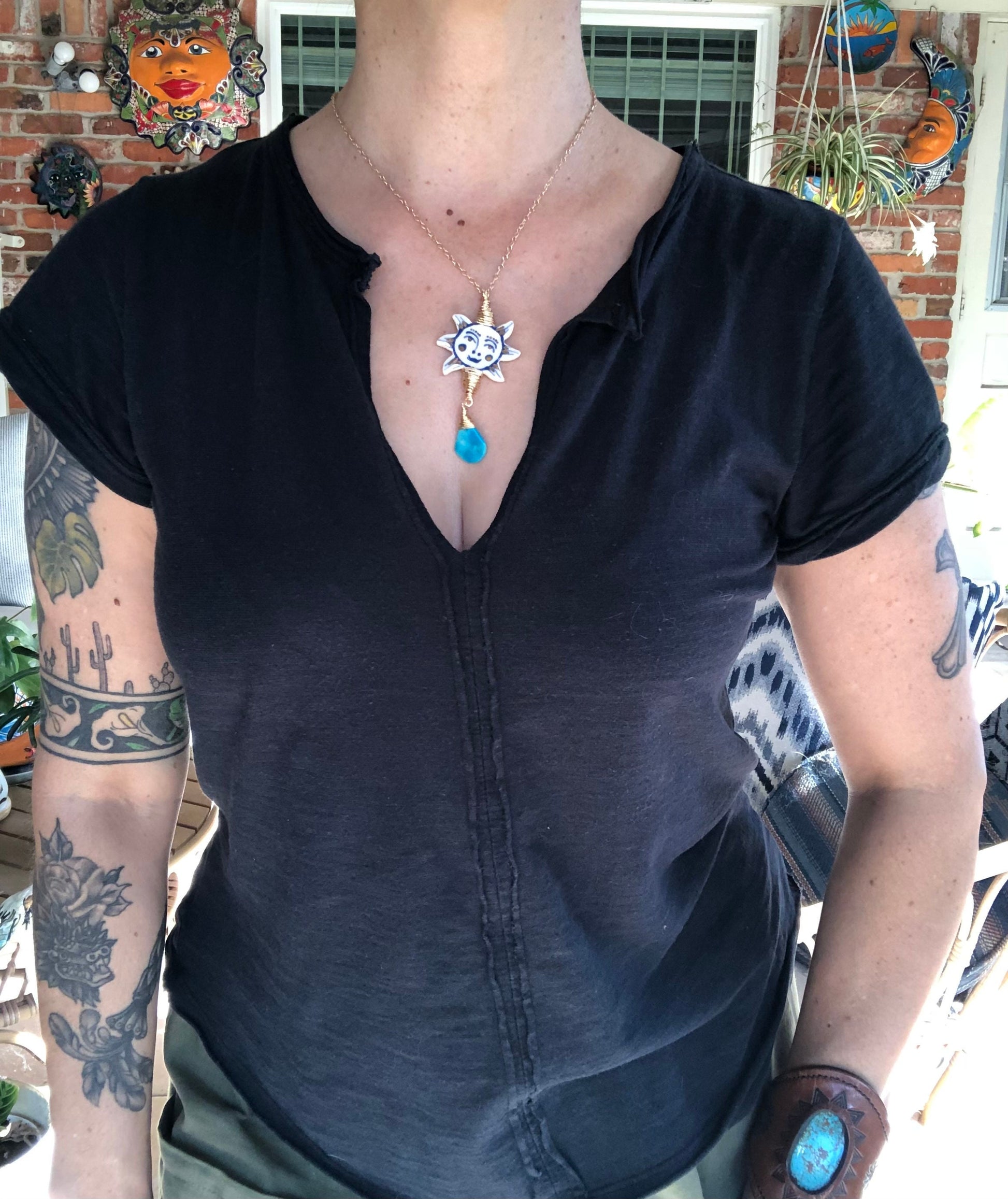 Ceramic Folk Sun and genuine turquoise Charm Necklace