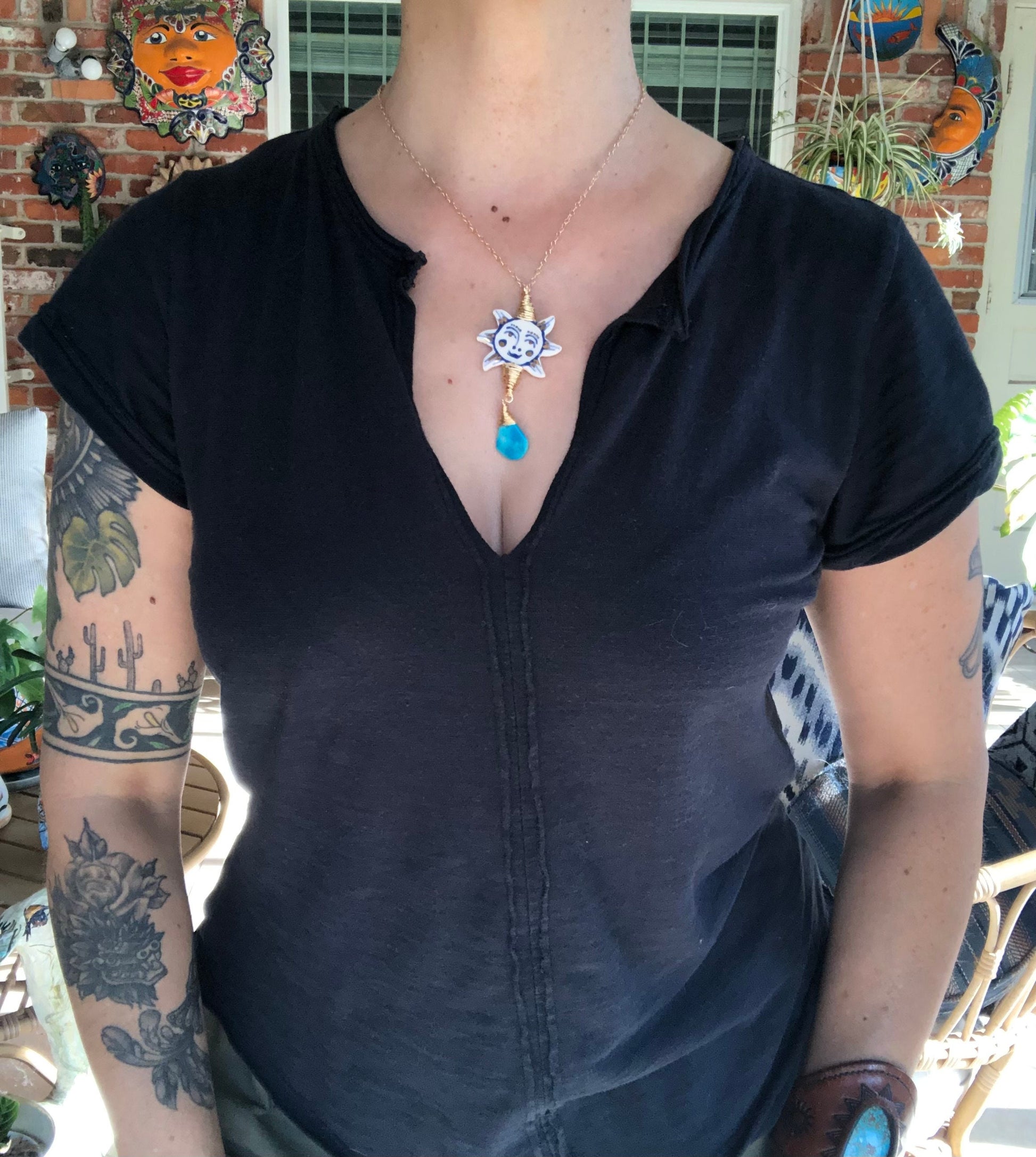 Embrace the warmth of handcrafted charm with this delightful necklace featuring a rustic ceramic sun bead paired with a genuine turquoise drop. Each piece celebrates artisanal craftsmanship and natural beauty, bringing a touch of bohemian spirit to your everyday style. The sun symbolizes joy and vitality, while the turquoise adds earthy elegance and timeless appeal. Perfect for layering or wearing solo, this folk-inspired treasure is a wearable reminder to shine bright and stay grounded.