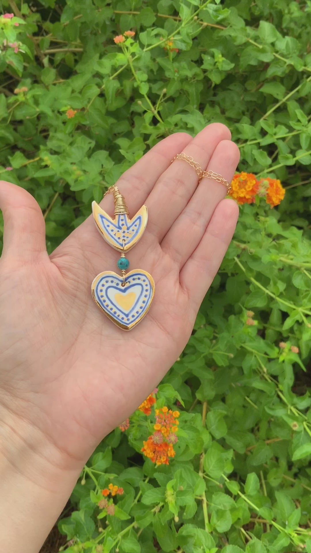 Make a bold statement with this Ceramic Milagro and Turquoise Charm Necklace. An eye-catching combo of a ceramic milagro heart and genuine turquoise pops against a backdrop of golden luster. Take a leap of faith and show off your one-of-a-kind style!