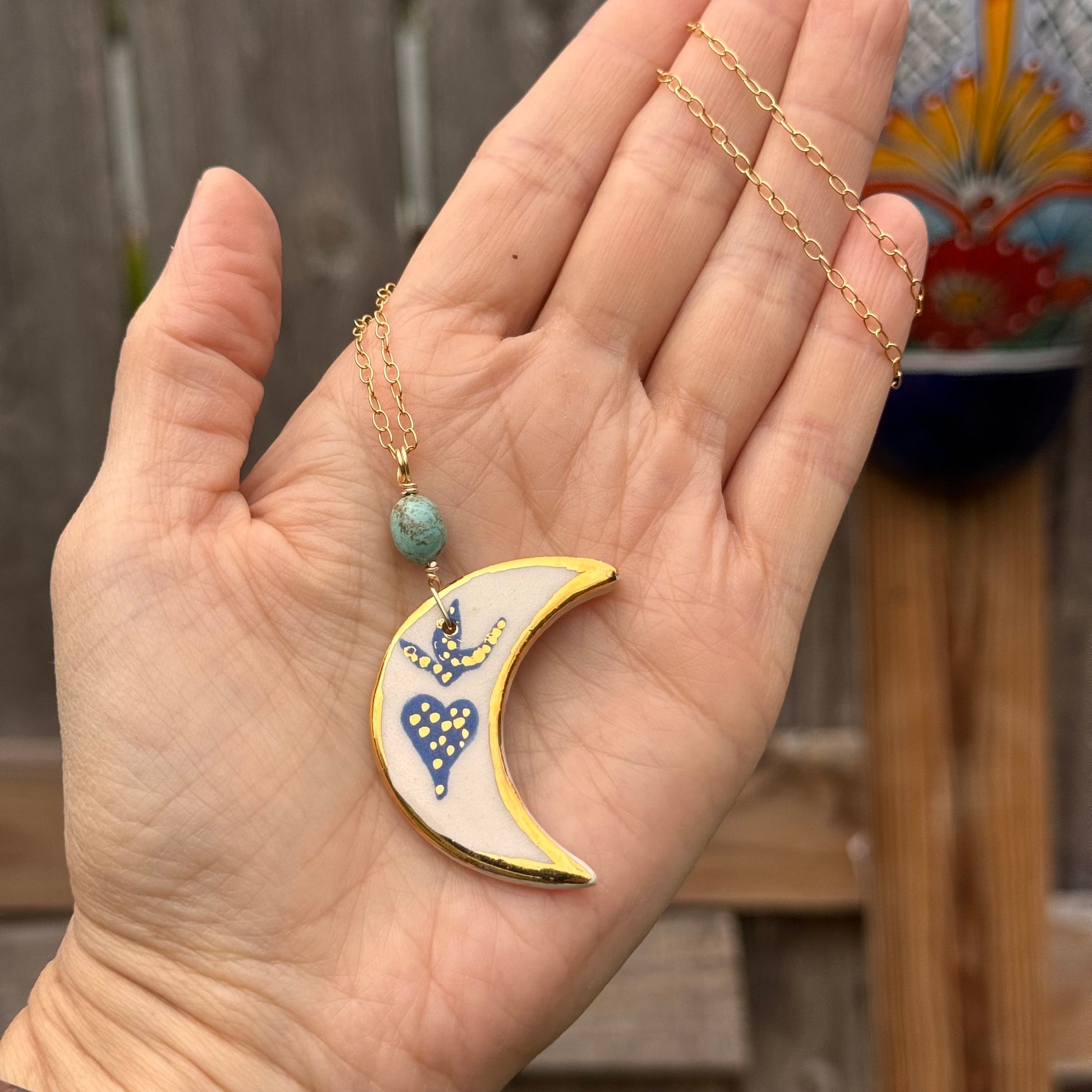 Ceramic Sacred crescent moon and genuine turquoise Charm Necklace