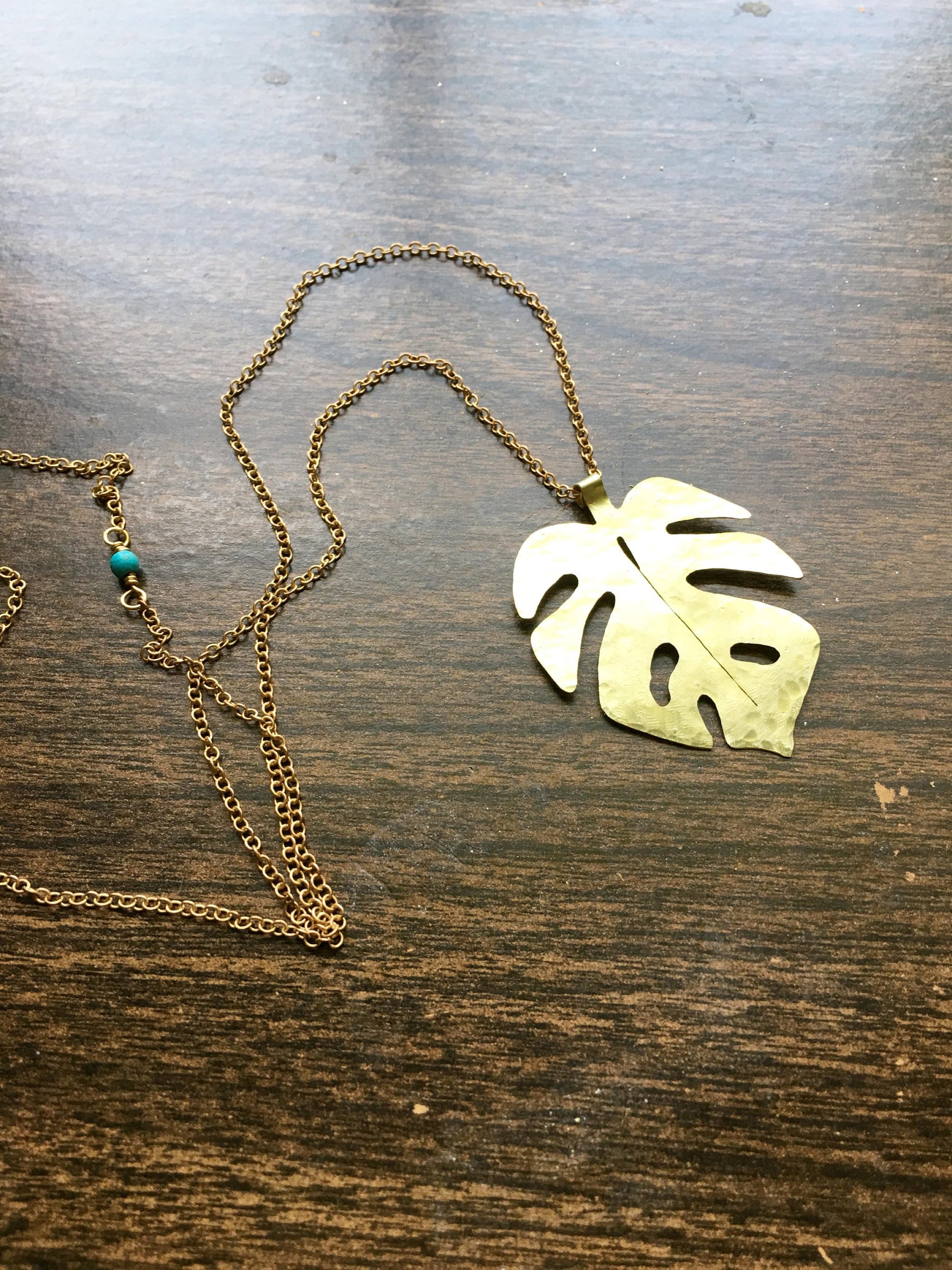 Hammered Brass Monstera Leaf Pendant Necklace - Long Length