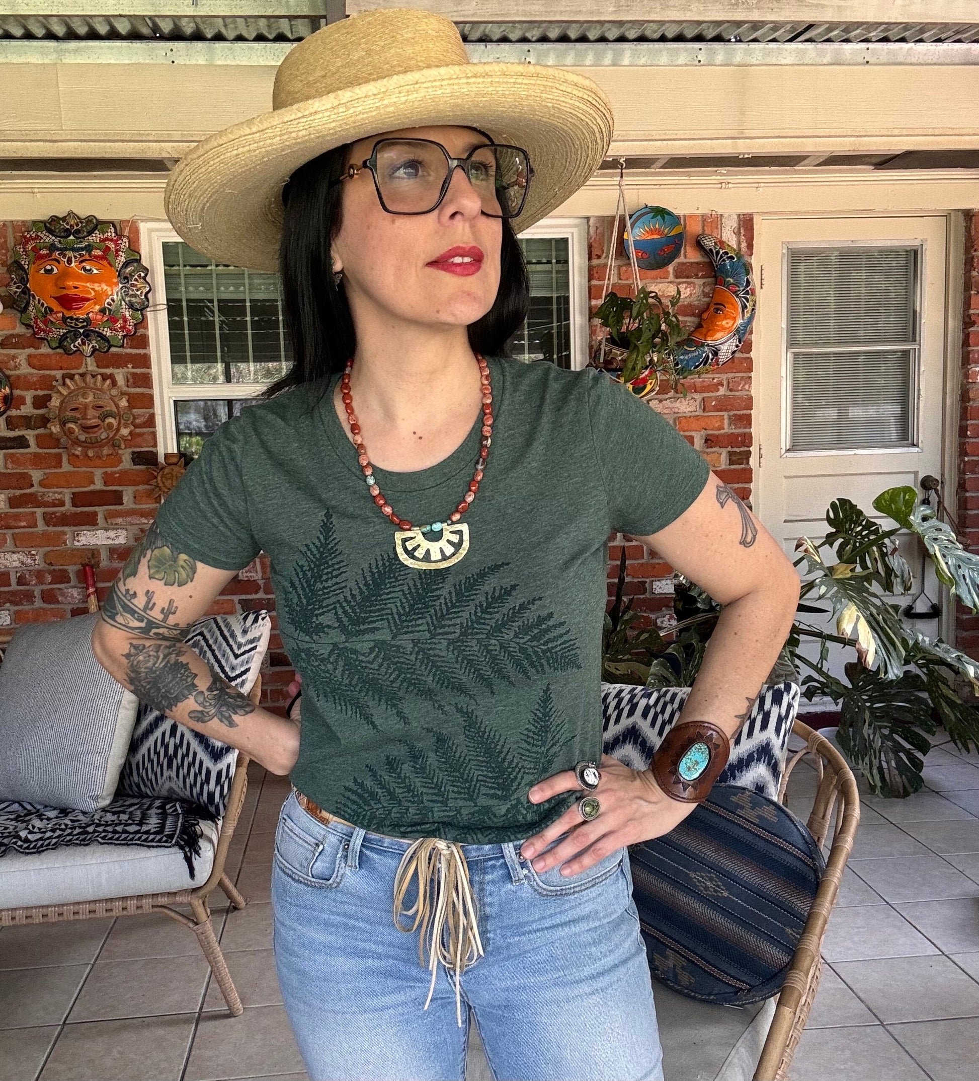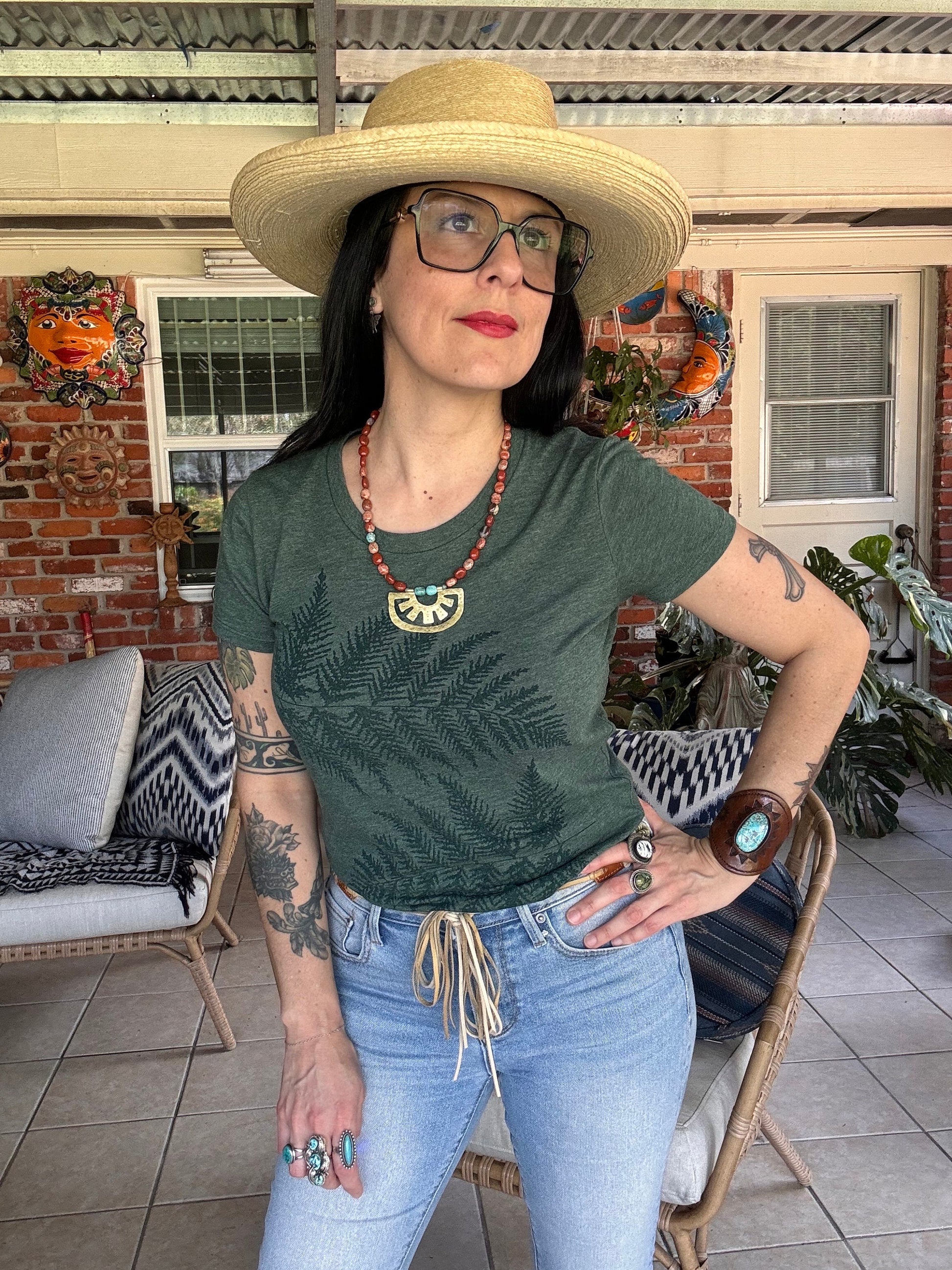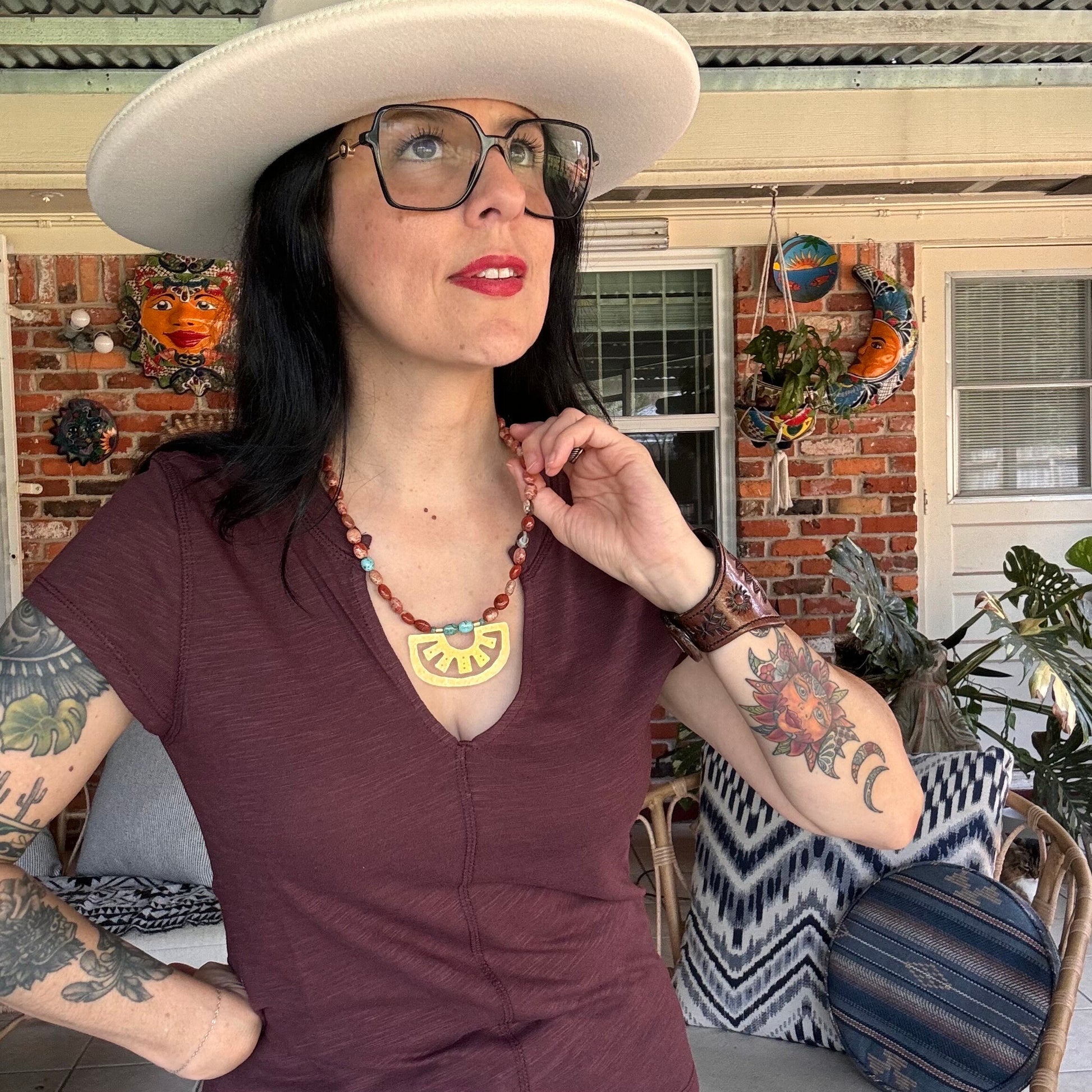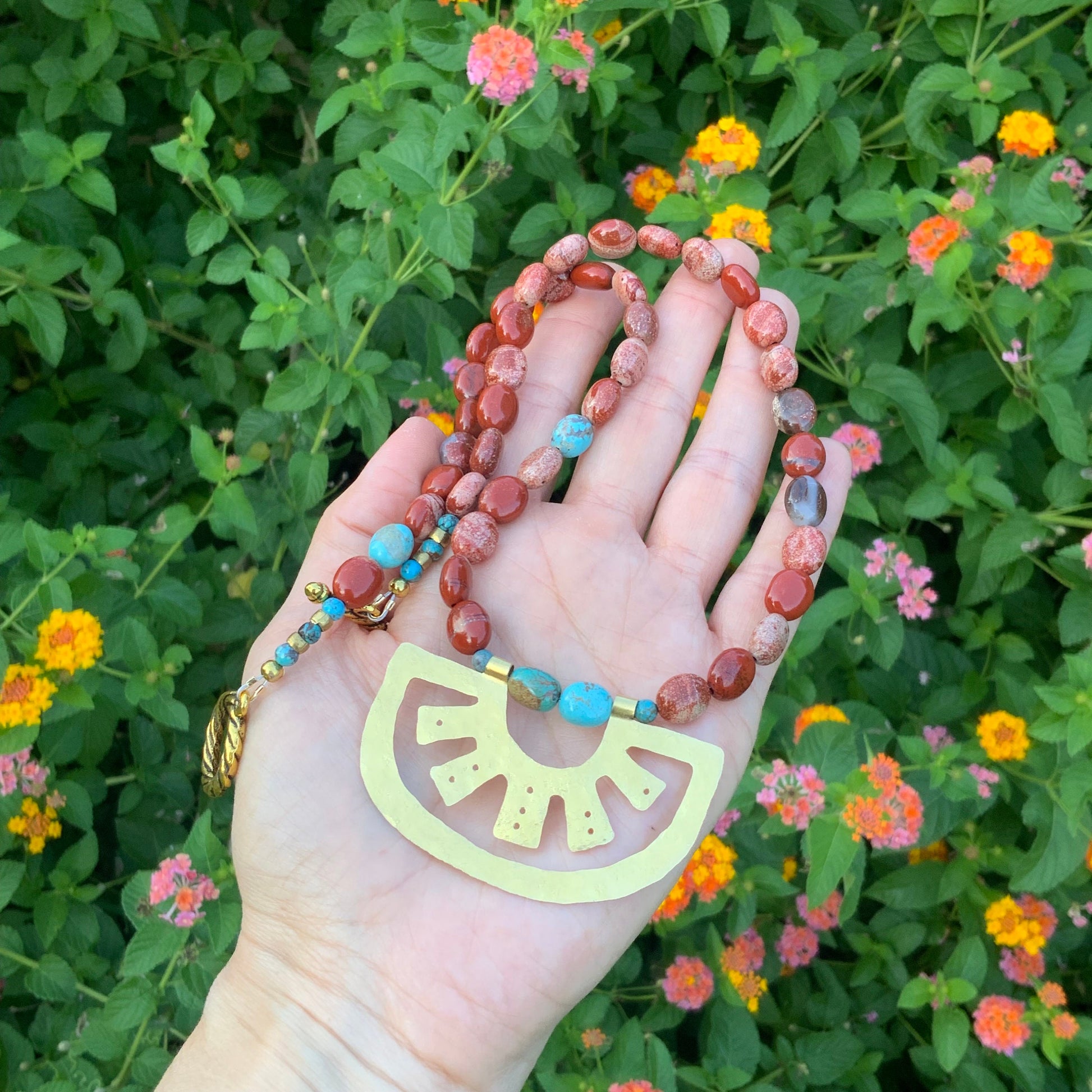 This vibrant necklace combines the rustic charm of hand-cut, hammered raw brass with pops of red jasper and turquoise beads. Inspired by ancient Mexican jewelry, each piece is lovingly crafted by Adriana to add a playful, earthy vibe to your look. Perfect for those who love unique, artisanal accessories with a story!