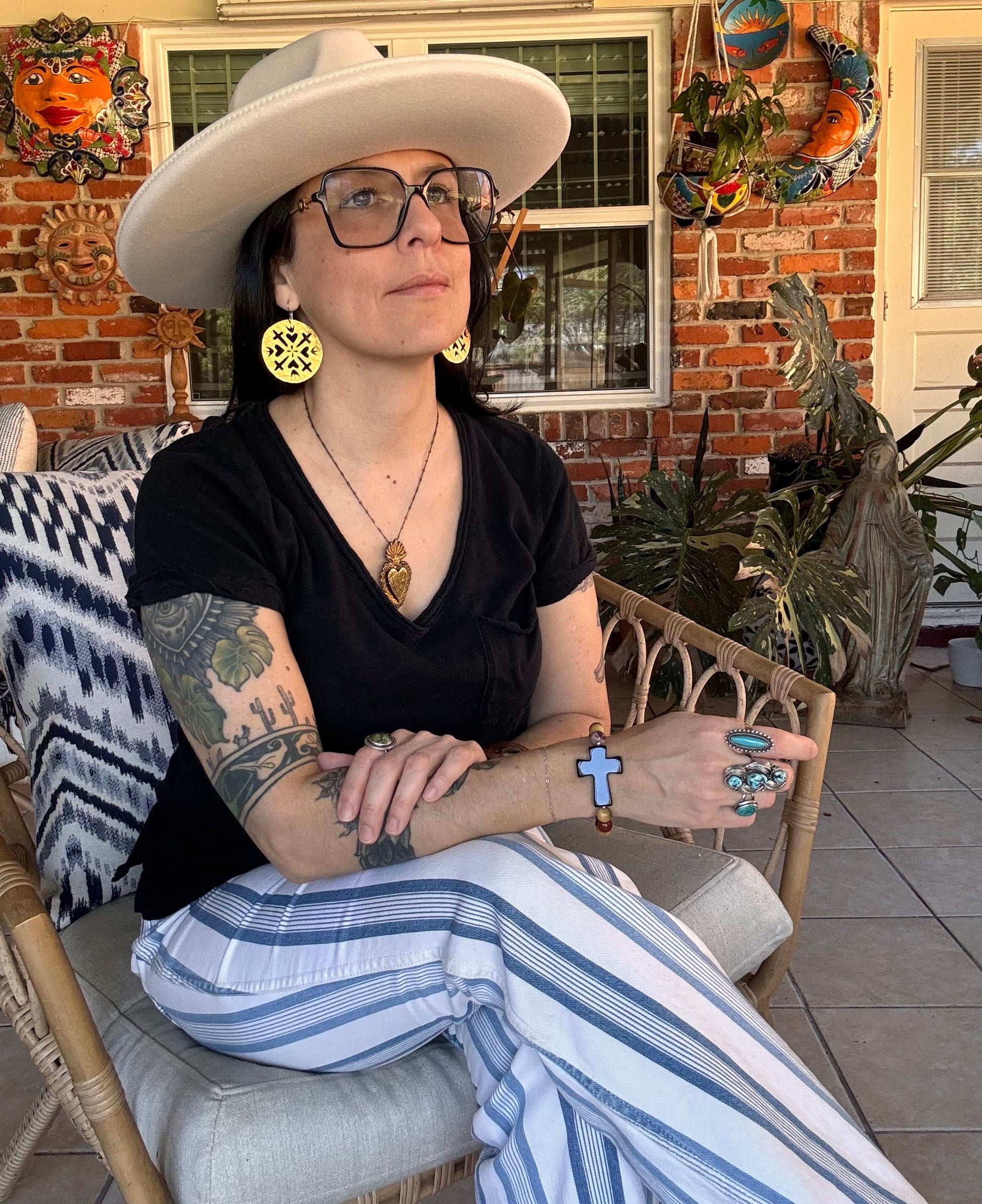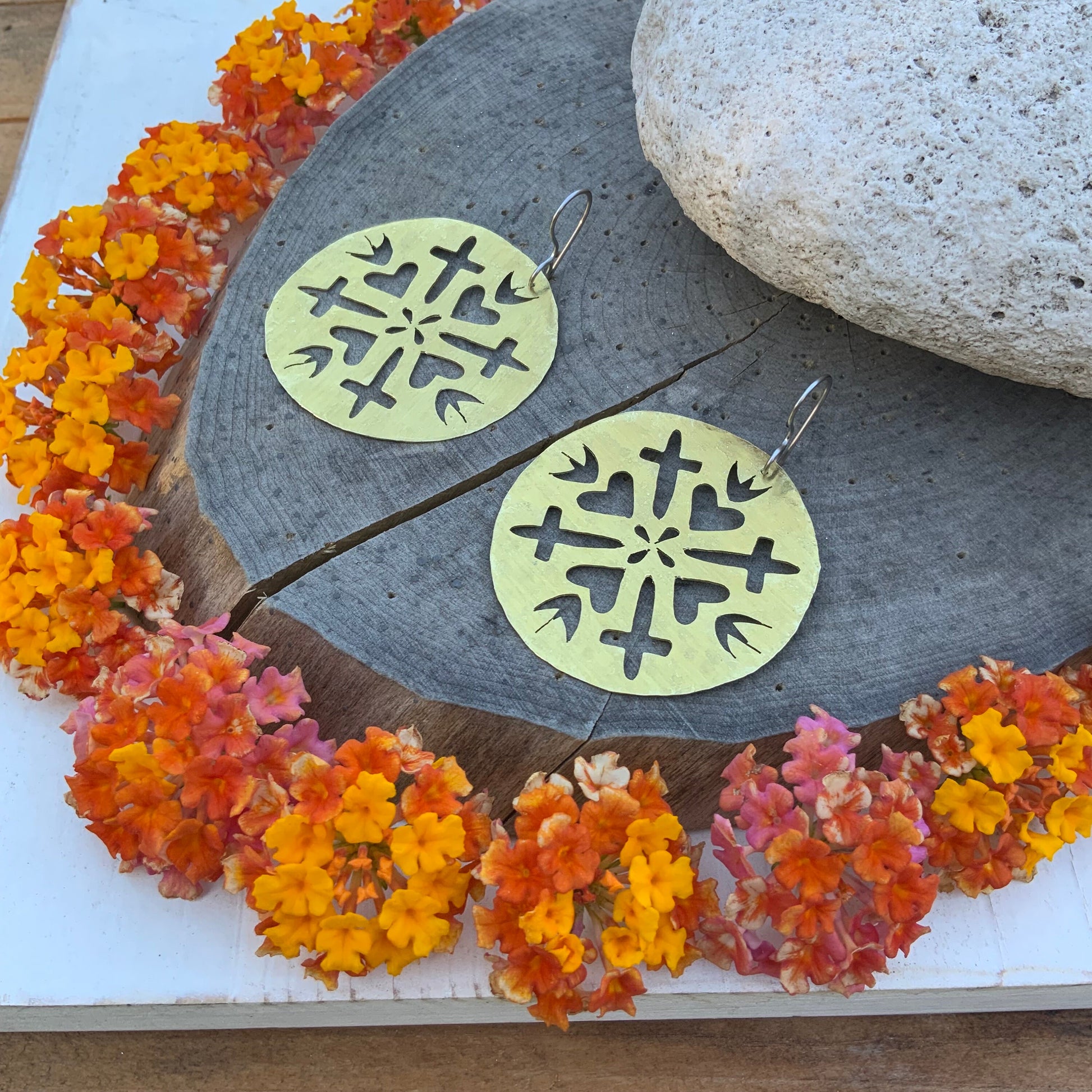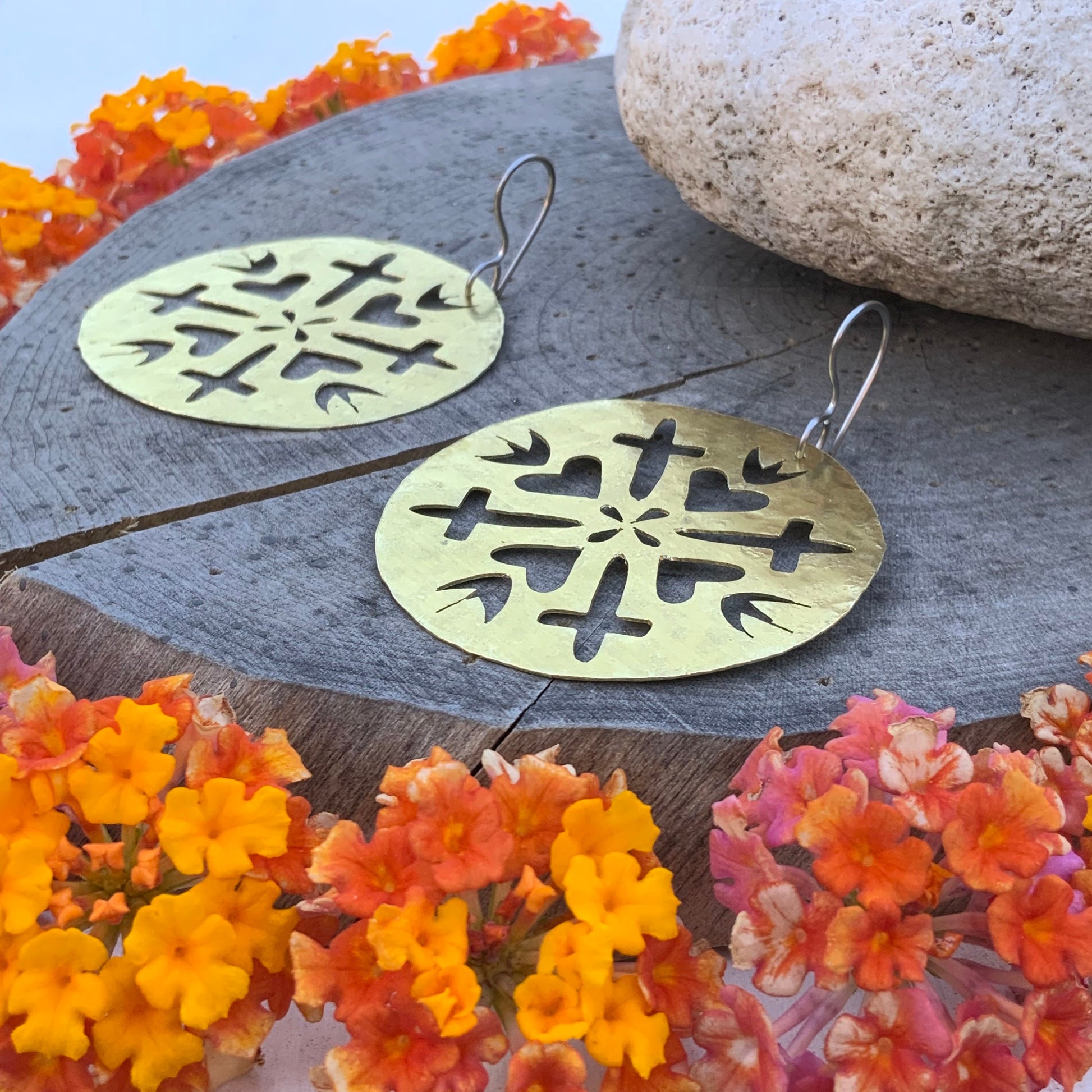 These hammered brass earrings, hand-cut by Adriana herself, blend sacred hearts and crosses into a charming design. Each pair showcases unique craftsmanship with a playful twist, perfect for adding a touch of personality and spirit to any outfit. Light, bold, and full of character, they’re jewelry with heart—and a whole lot of soul.
