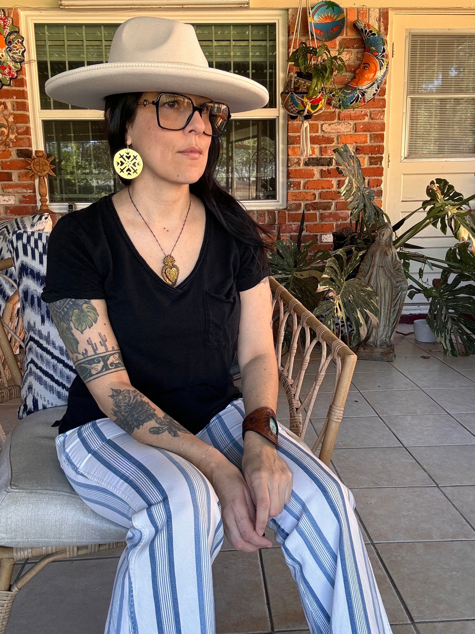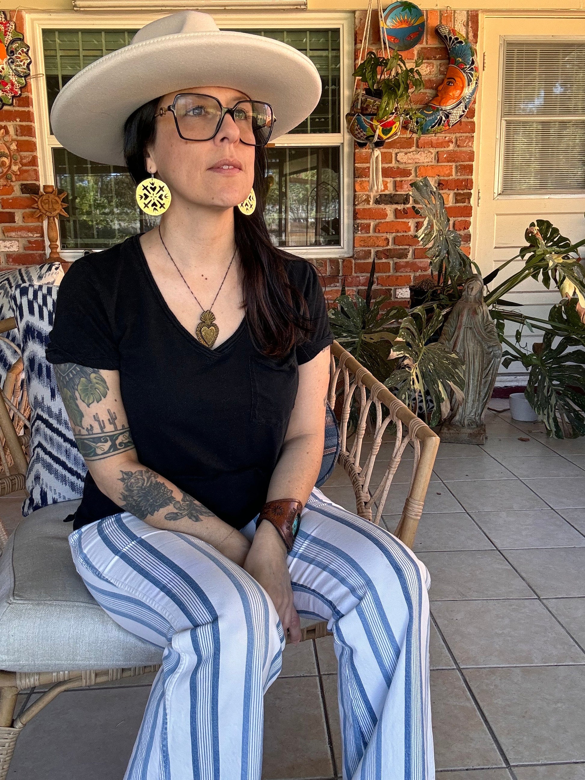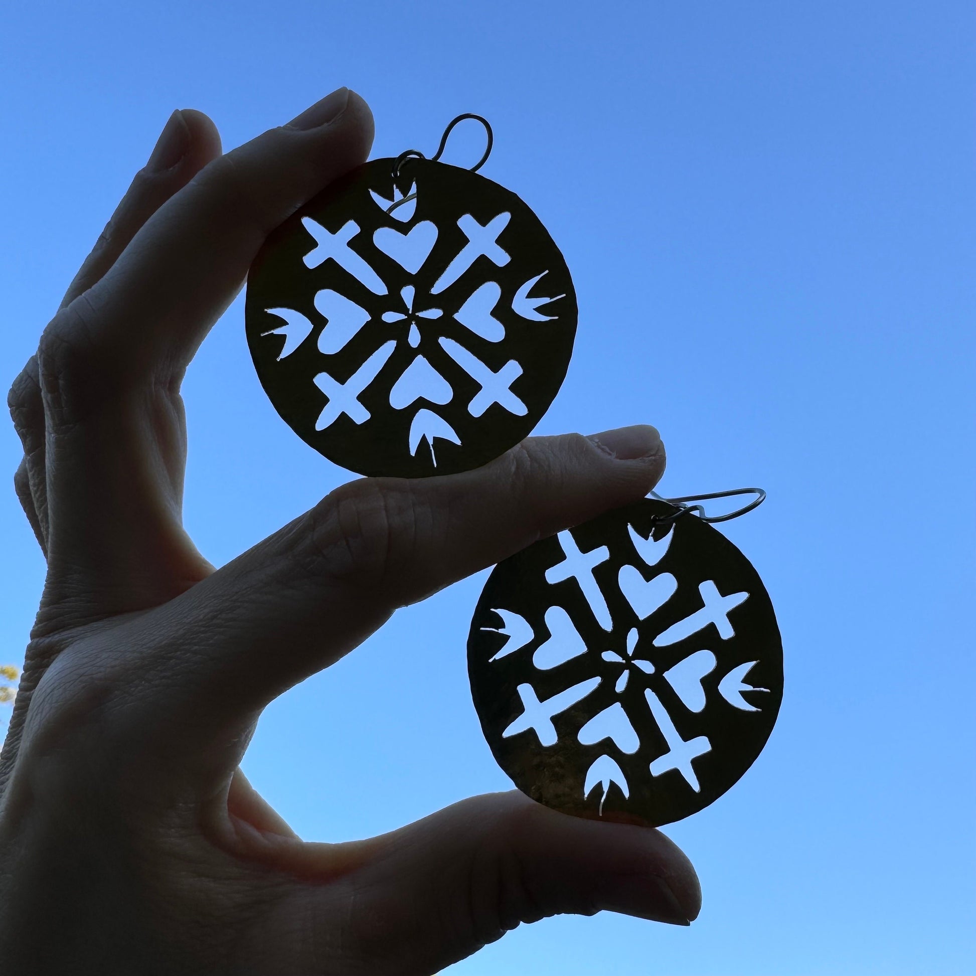 These hammered brass earrings, hand-cut by Adriana herself, blend sacred hearts and crosses into a charming design. Each pair showcases unique craftsmanship with a playful twist, perfect for adding a touch of personality and spirit to any outfit. Light, bold, and full of character, they’re jewelry with heart—and a whole lot of soul.
