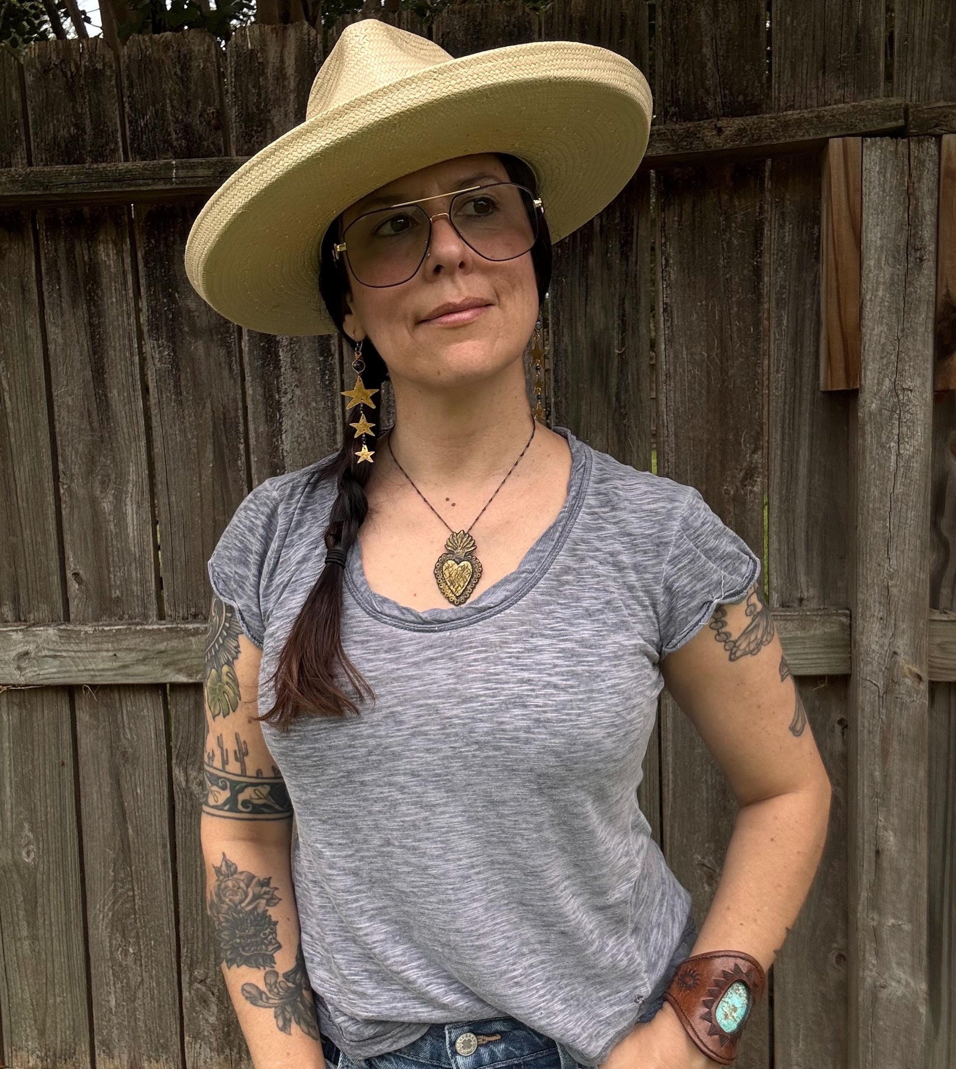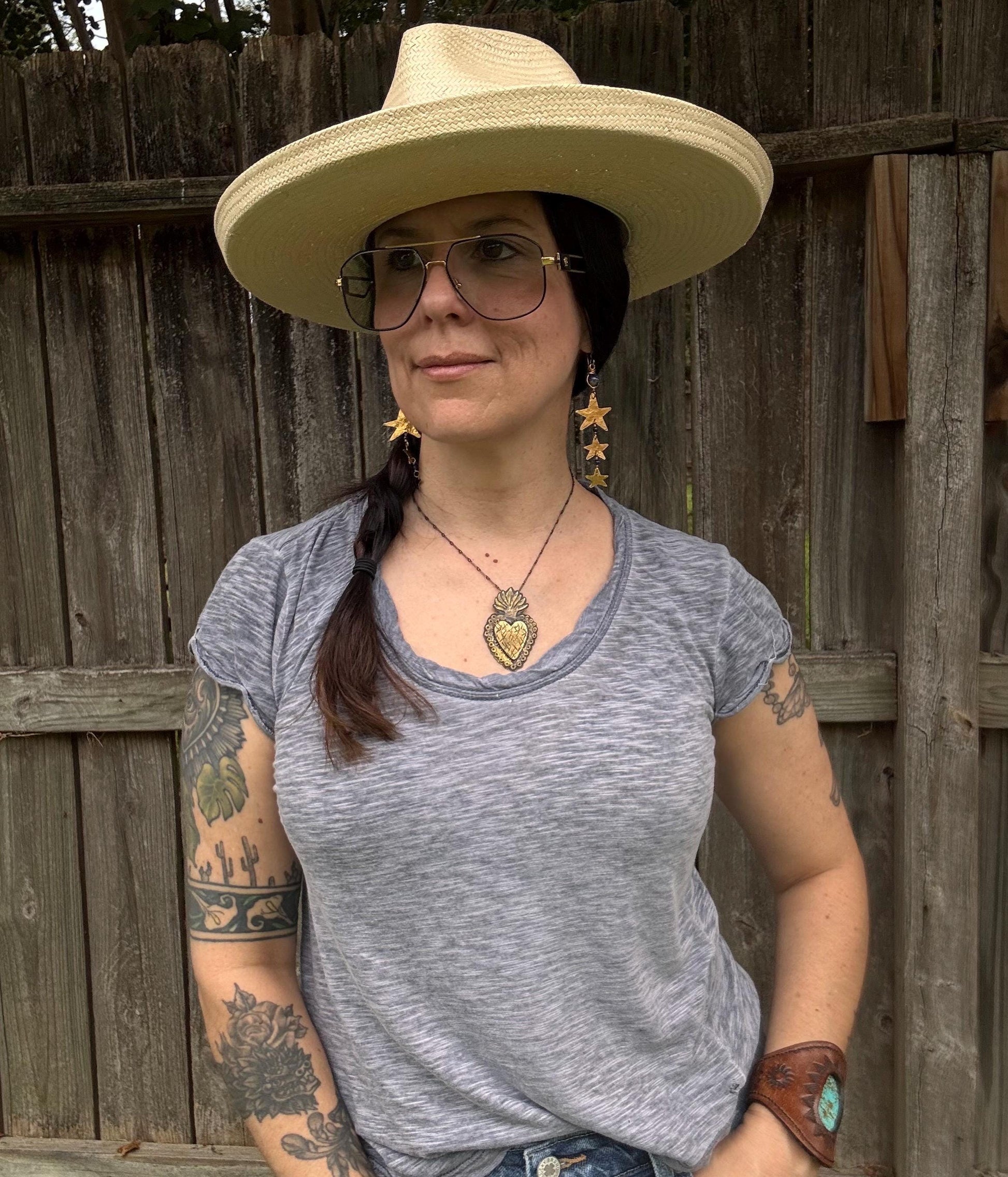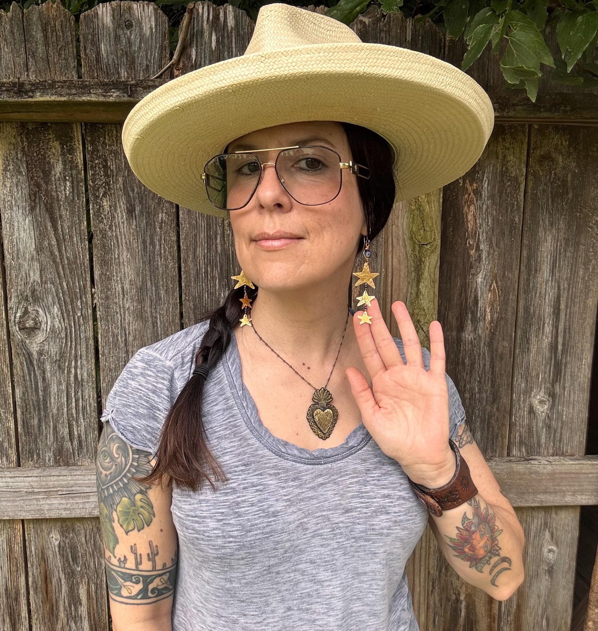 Add a touch of celestial charm with these hammered brass star shoulder dusters. Handmade with care, their shimmering stars and deep lapis accents dance with every movement, turning heads wherever you go. Lightweight and long, these playful earrings bring the magic of the night sky right to your shoulders. Perfect for adding sparkle to any outfit!