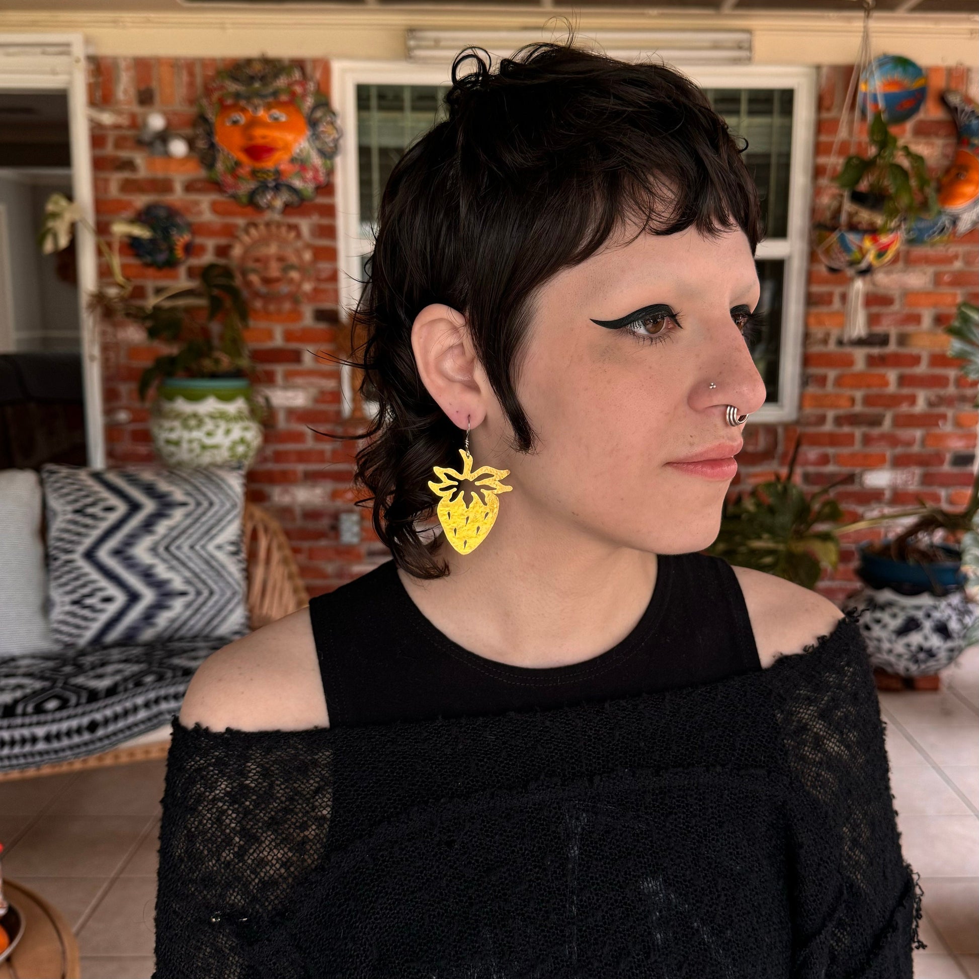 Add a splash of whimsy with these hammered brass strawberry earrings. Each berry is hand-cut from metal, giving them a unique, textured look that’s both playful and charming. Perfect for anyone who loves fresh, fun accessories with a handcrafted touch.