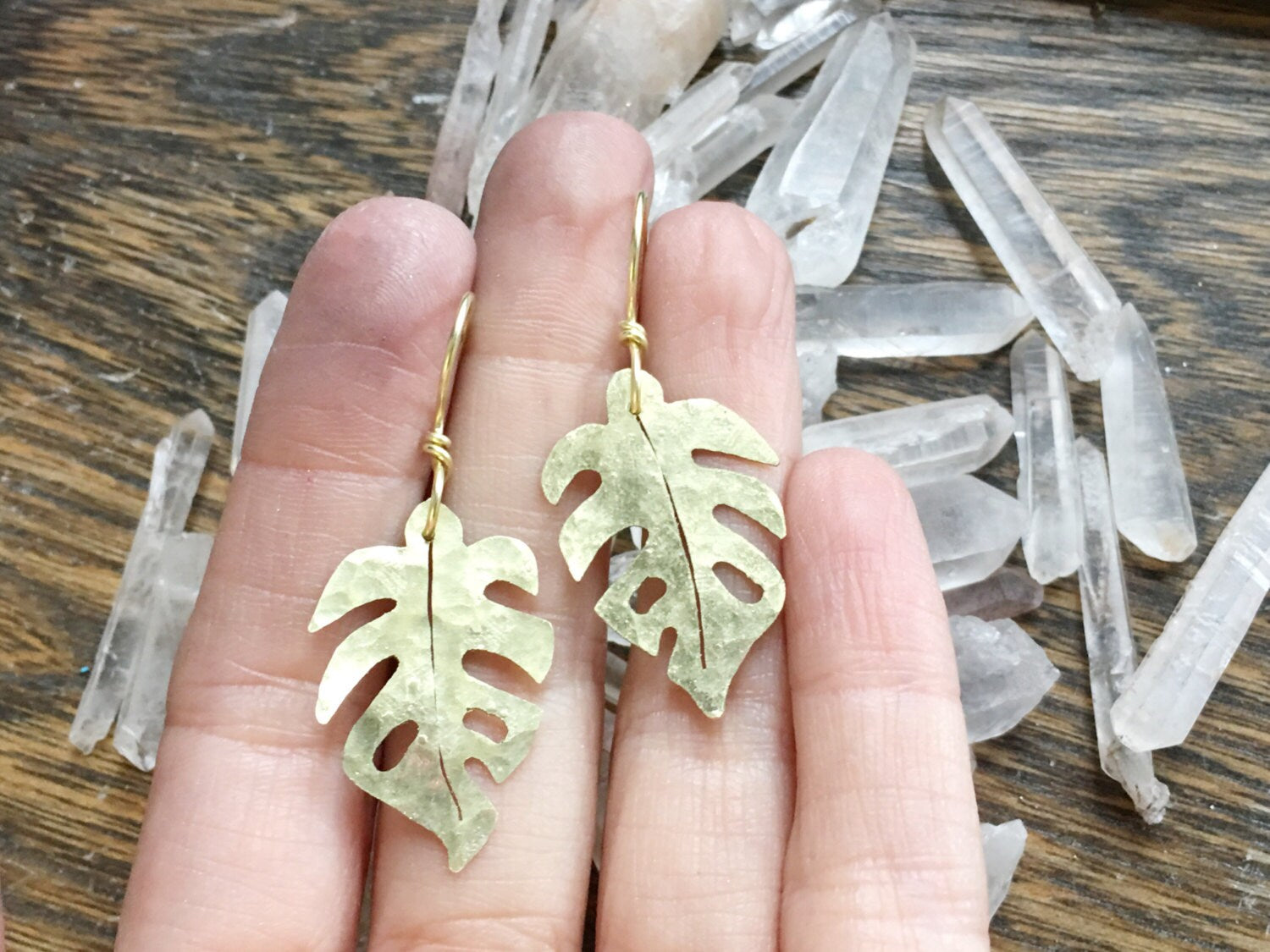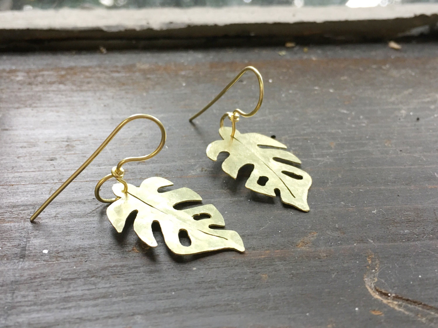 Handmade Brass Monstera Leaf Earrings: Tropical Jewelry