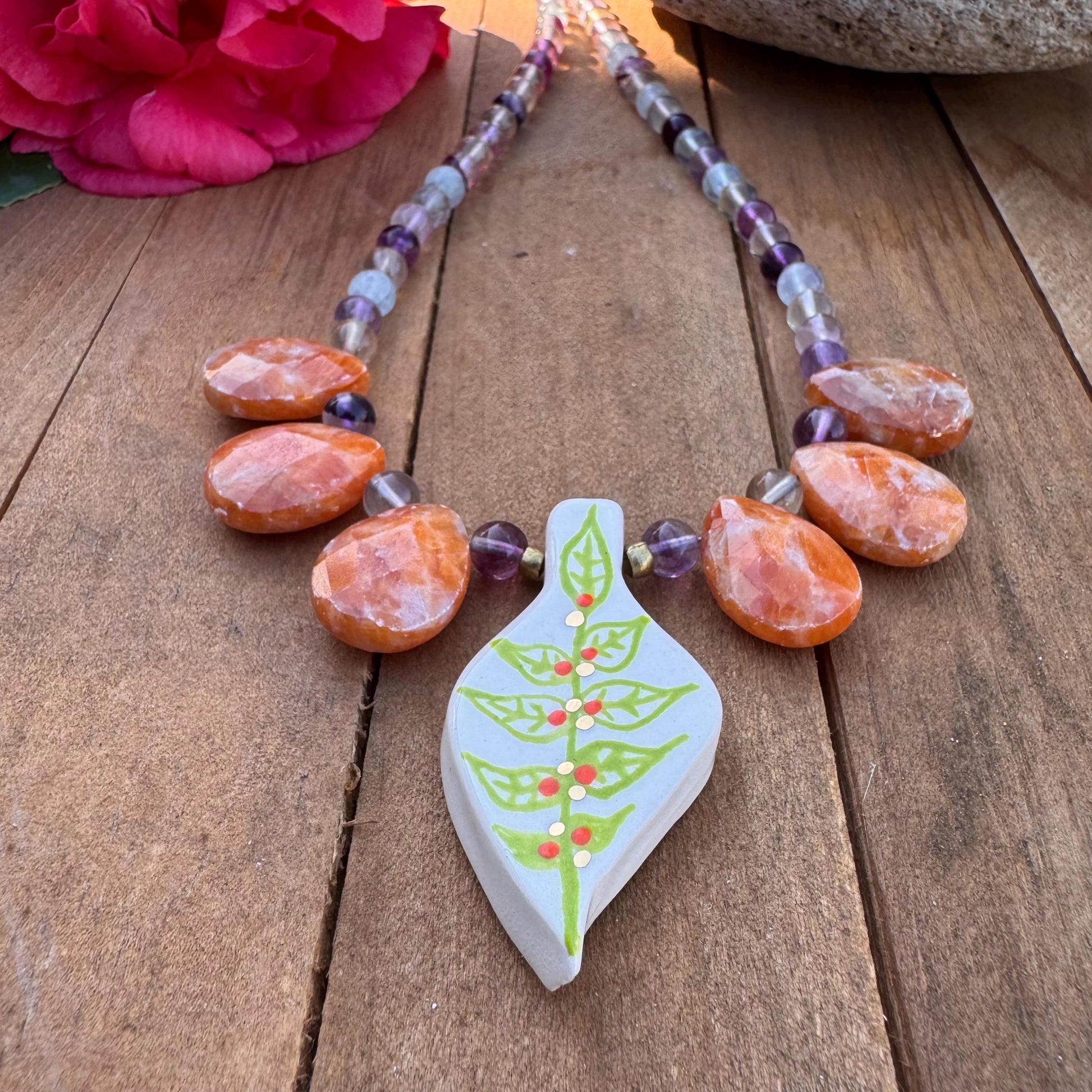 Handmade Ceramic Leaf Necklace: Orange Calcite & Fluorite Beaded Jewelry
