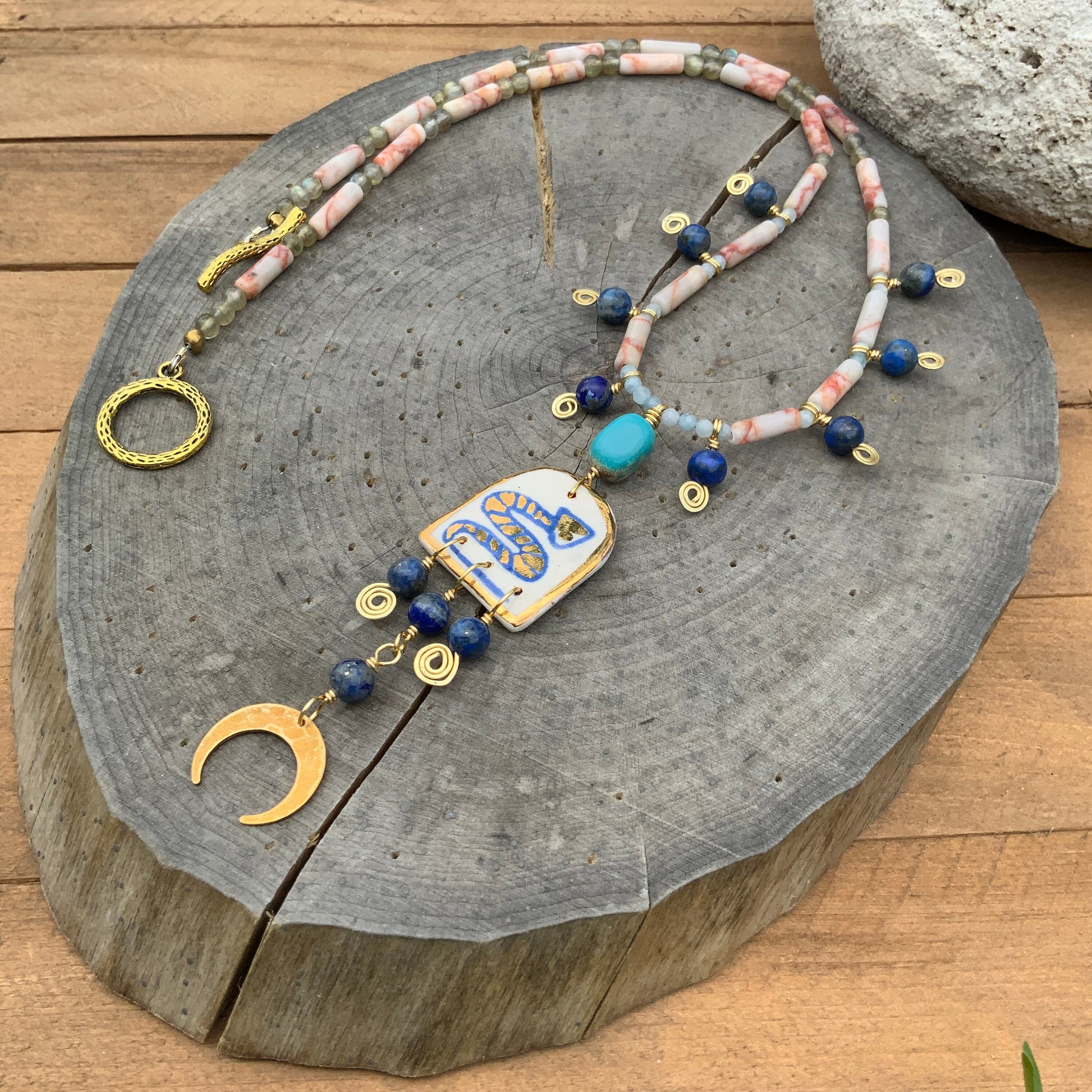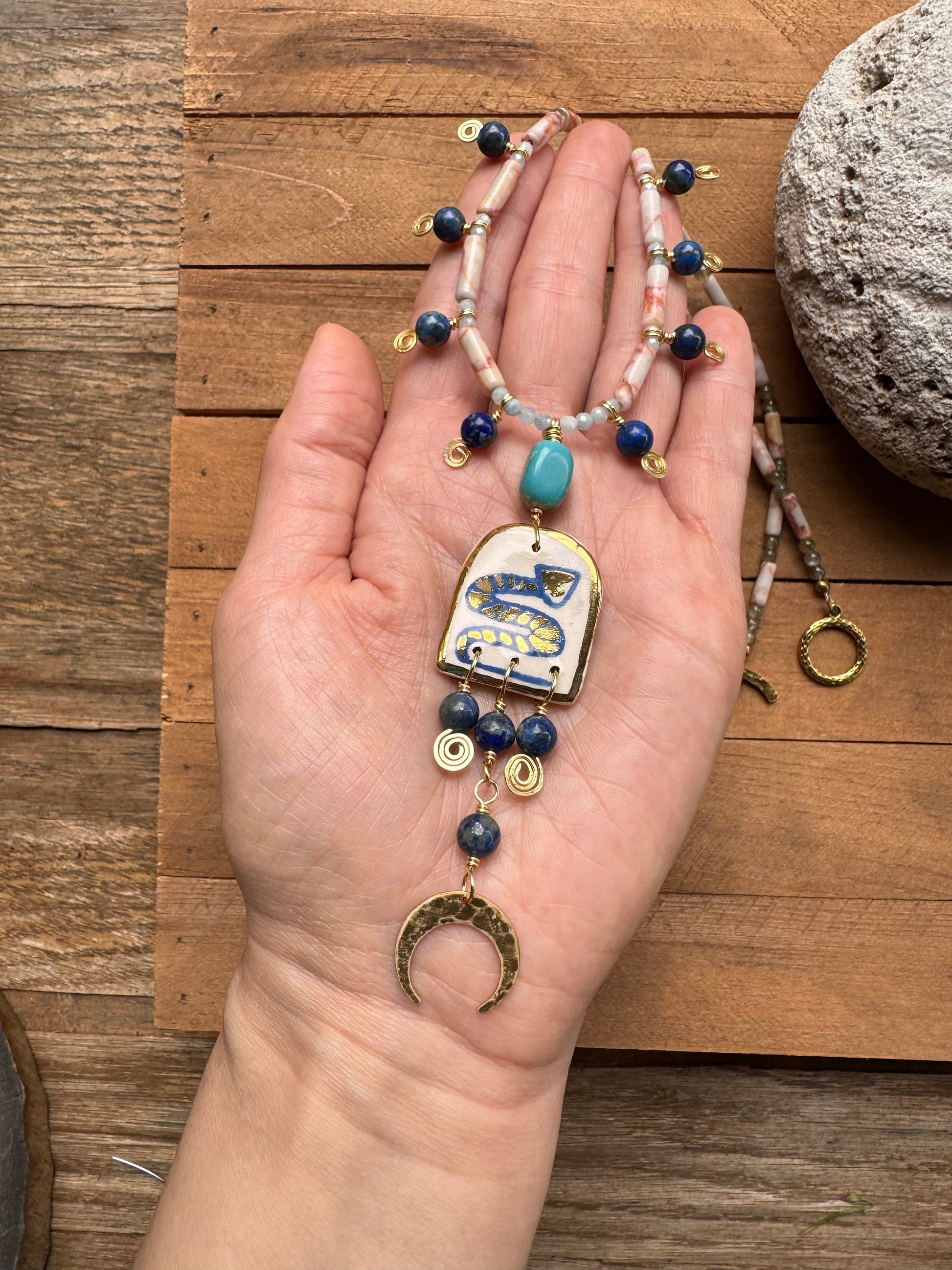 Handmade Ceramic Snake Necklace: Turquoise, Lapis & Labradorite