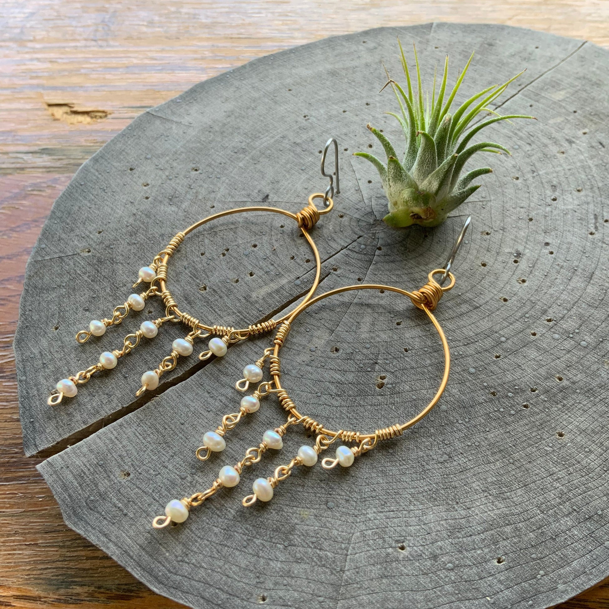 These whimsical freshwater pearl chandelier earrings feature delicate thin hoops adorned with a playful fringe of lustrous pearls. Watch them sway and catch the light with every turn of your head—it's like wearing tiny celebrations on your ears. Handcrafted with care, each pair showcases the natural beauty of freshwater pearls, making them perfect for brides who want something special or anyone craving a touch of understated sparkle. Lightweight and comfortable, they're ready to become your new favorite accessory for weddings, date nights, or just because.