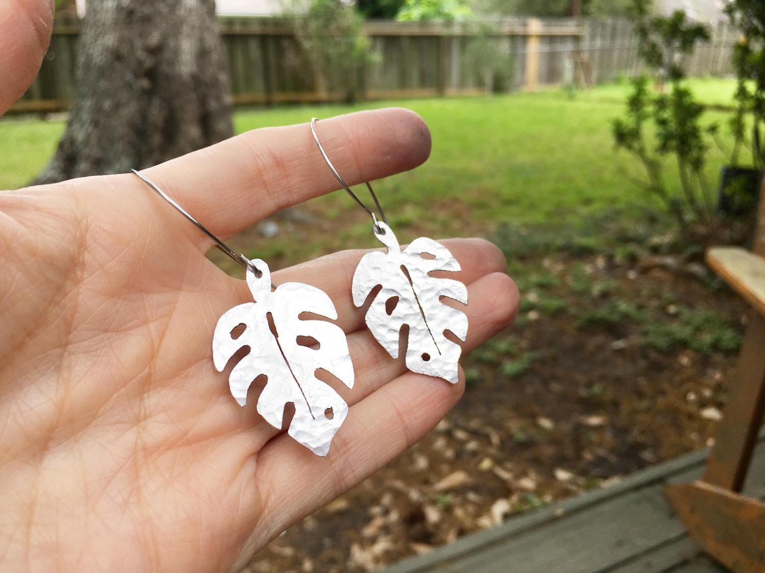 Handmade Monstera Leaf Earrings: Hammered Metal Foliage