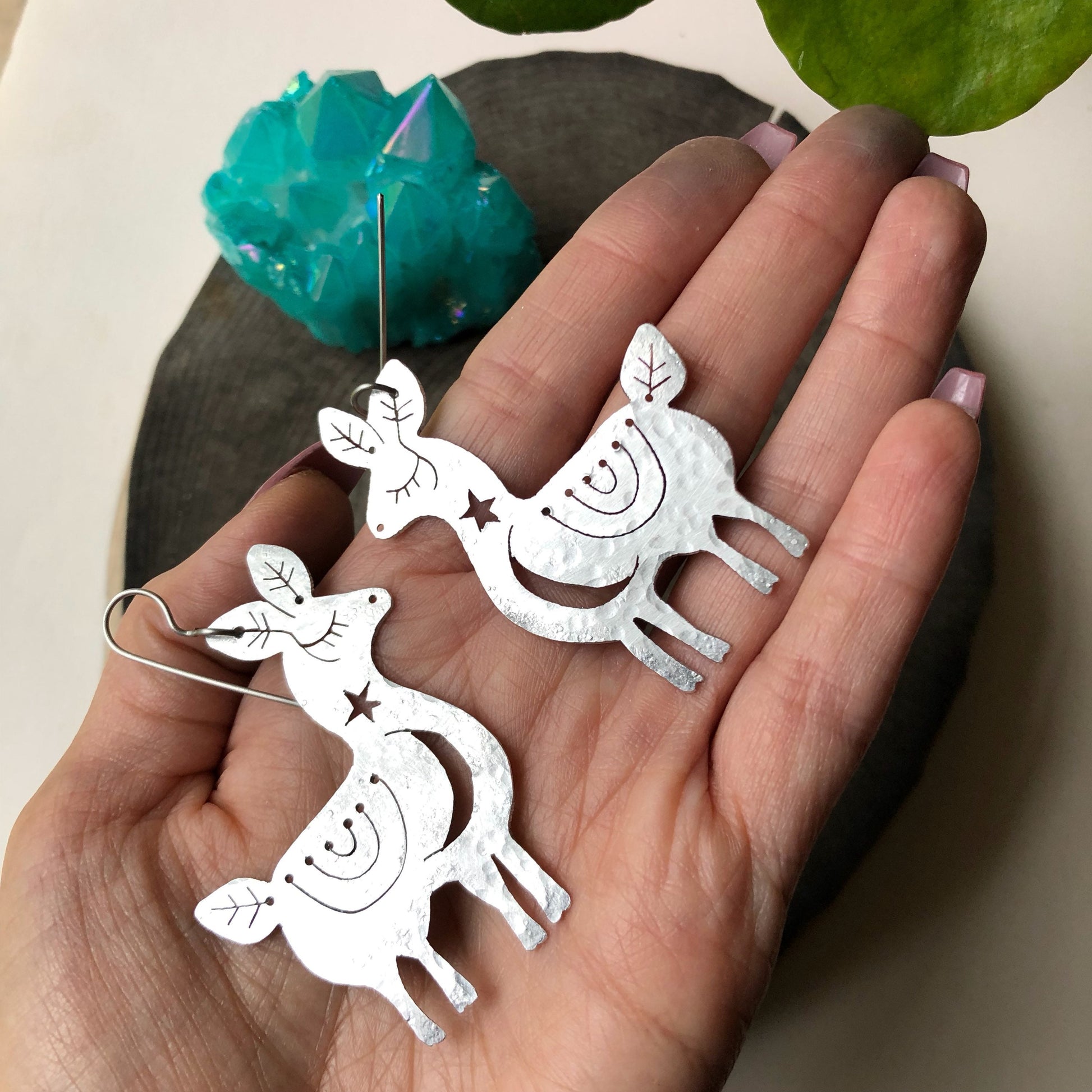 Llama lovers, rejoice! These enchanting celestial earrings are hand-cut by Adriana with stellar attention to detail. Each pair showcases whimsical llamas adorned with dreamy luna designs, drawing inspiration from vibrant Otomi art traditions. Pick your perfect metal: lightweight aluminum for everyday wear, warm brass for a vintage touch, or rich copper for an earthy vibe. These playful, handcrafted treasures are made for anyone who celebrates quirky style and appreciates artisan craftsmanship.