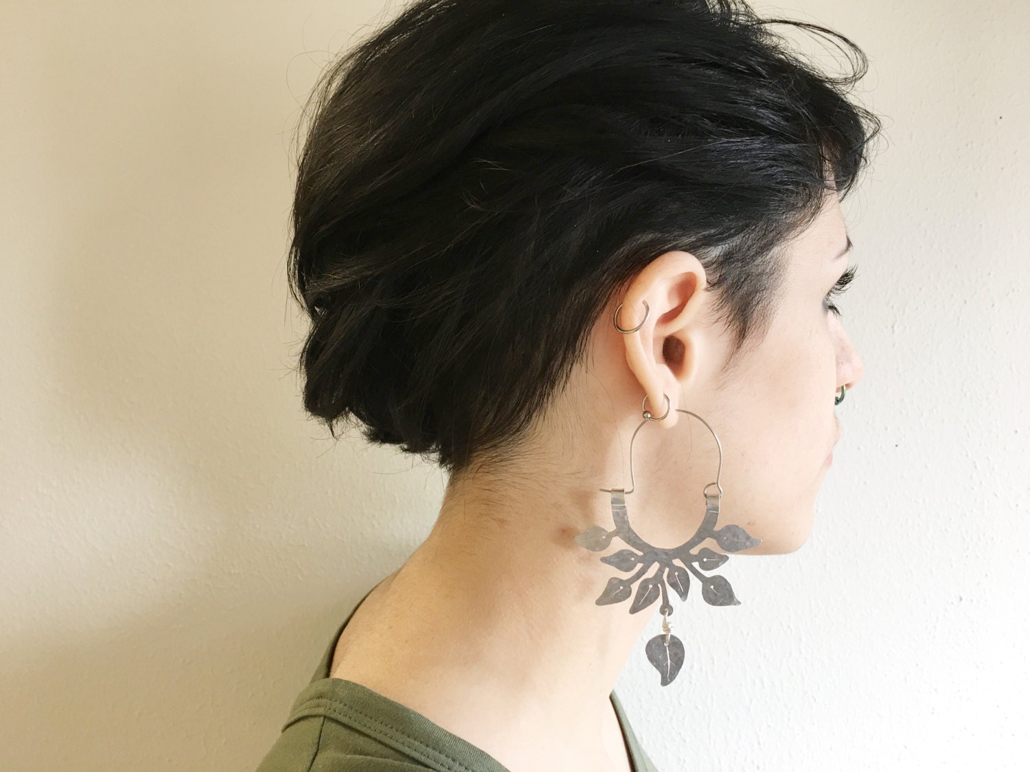Handmade Pothos Leaf Hoop Earrings: Hammered Aluminum Botanical Jewelry