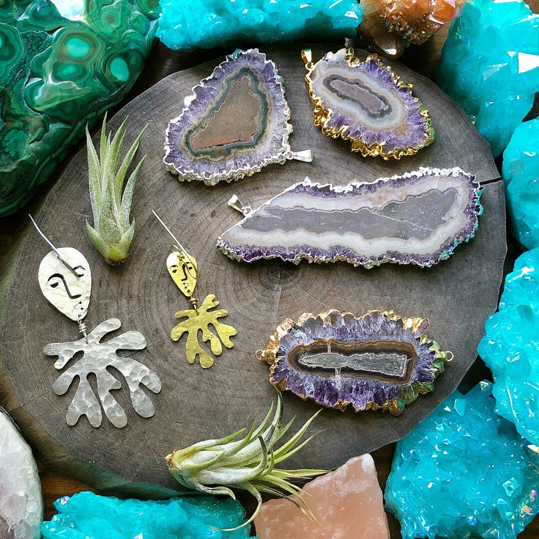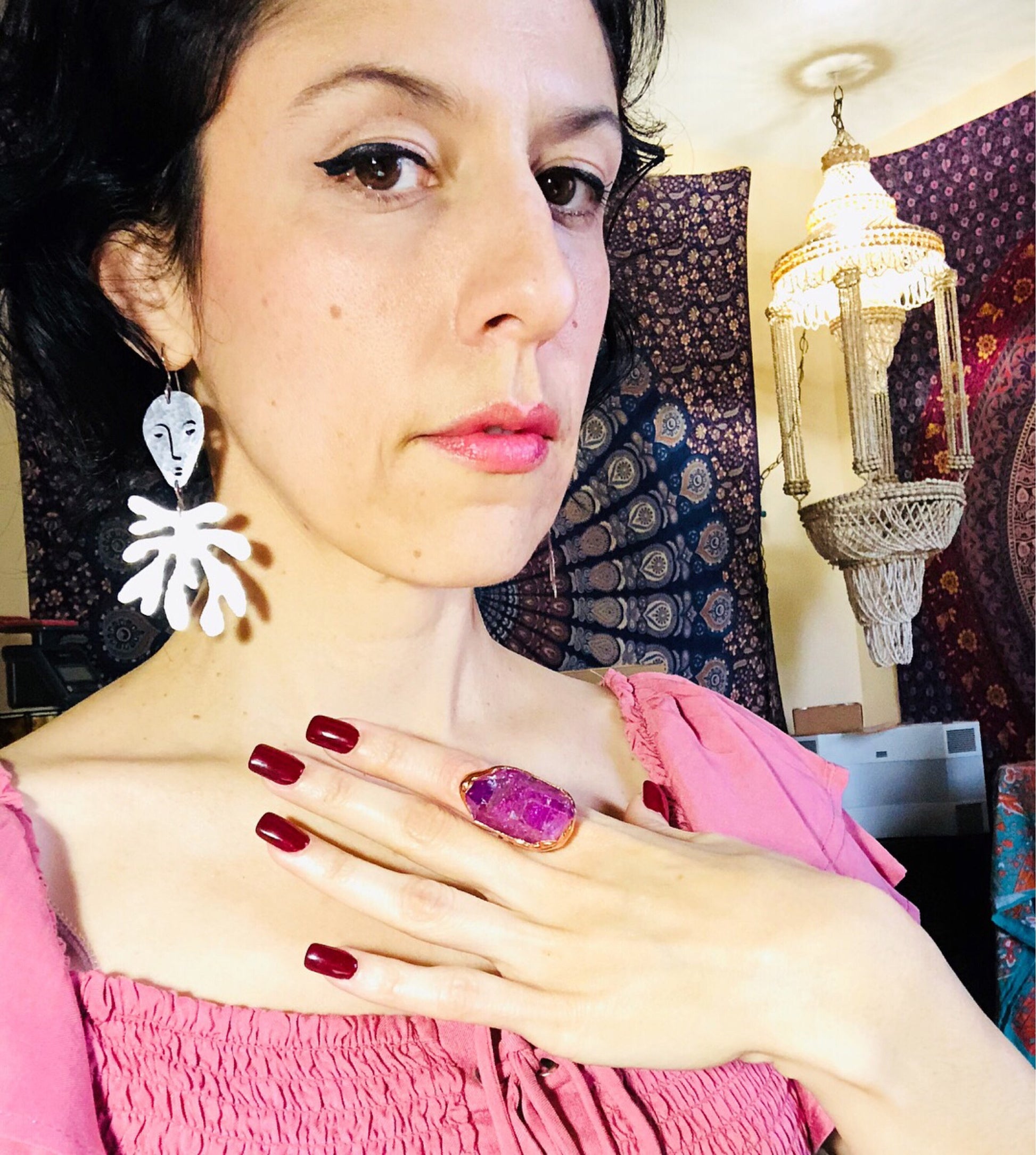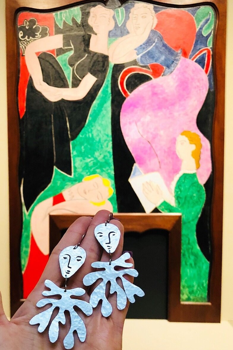 These whimsical earrings blend surrealism with contemporary design, featuring abstract faces and laurel motifs crafted from brass. Each pair is individually hand-cut and hammered, giving them organic texture and movement. The modern shapes dance with personality, making them perfect for anyone who loves bold, artistic jewelry that sparks conversation. Lightweight and wearable art for your ears.