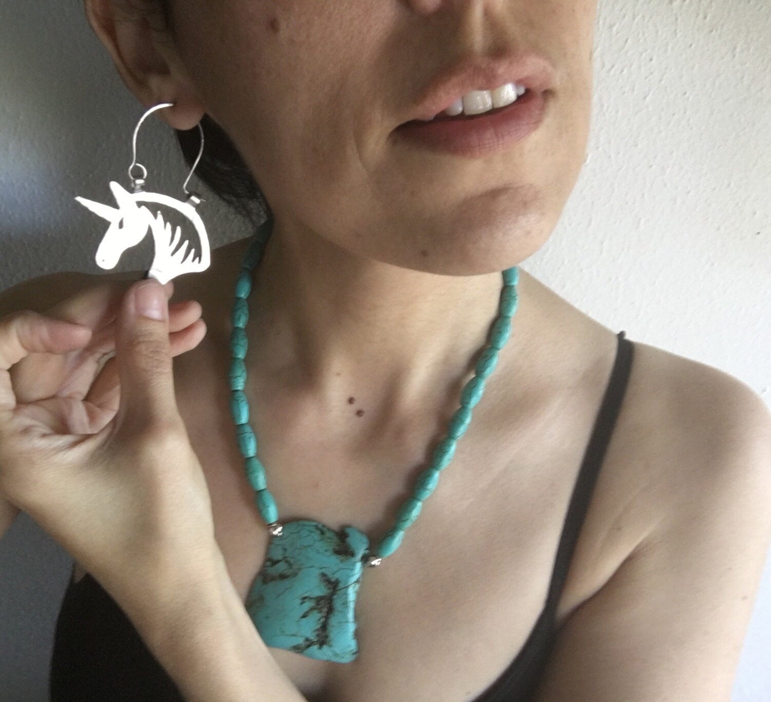 Turn heads with these enchanting hand-cut unicorn hoops that can also be made as a graceful horse (no horn). Available in lightweight aluminum or rich copper, each pair is meticulously crafted to capture the magic of mythical creatures. Perfect for dreamers, fantasy lovers, and anyone who refuses to grow up. These playful hoops bring sparkle and personality to your everyday style, whether you're channeling unicorn energy or channeling your inner equestrian. A whimsical accessory that celebrates the wonder in all of us.