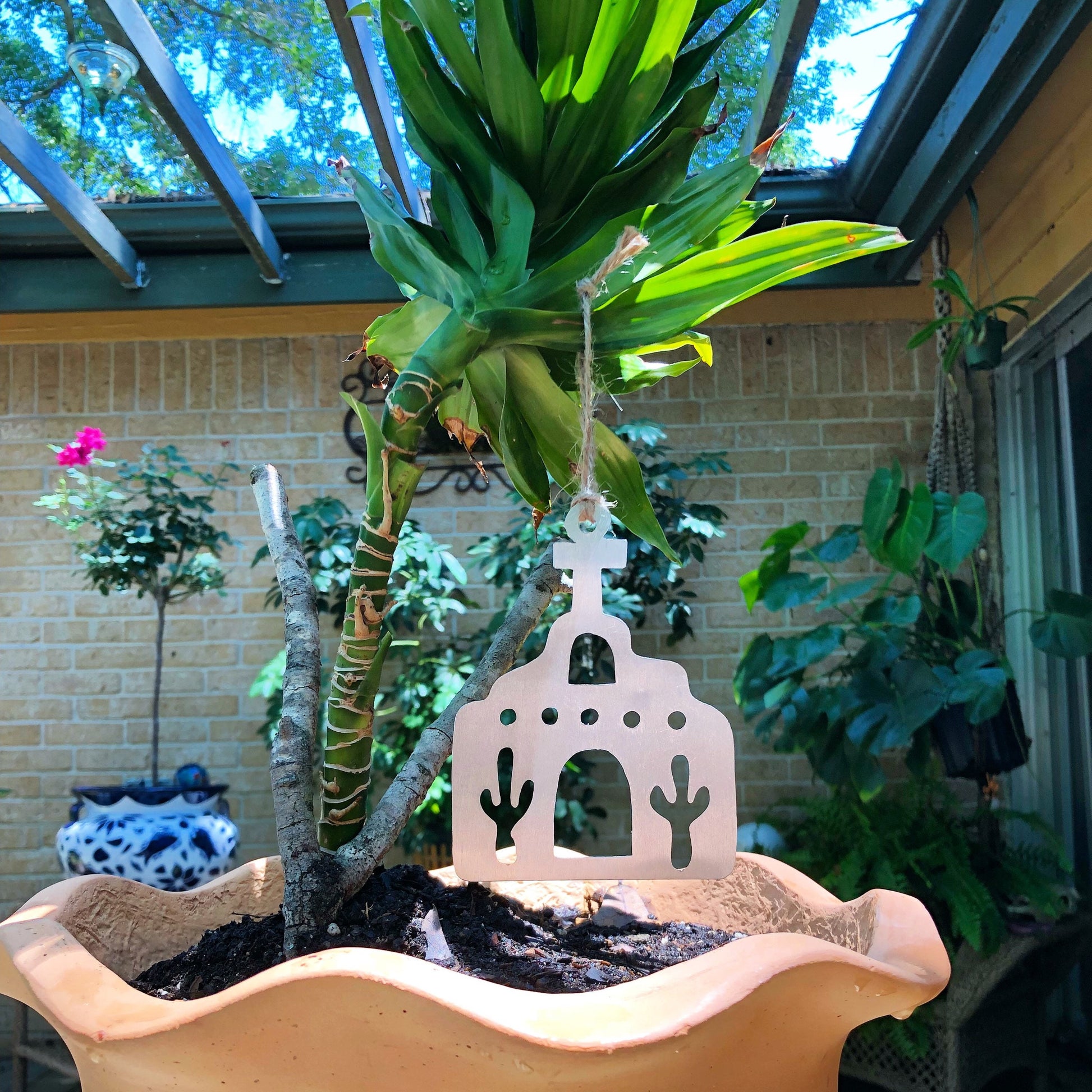 Celebrate Southwest charm with this hand-cut Metal Adobe Mission Ornament! Featuring a delightful saguaro cactus silhouette, it's crafted from your choice of copper, brass, or aluminum for a personalized touch. Perfect for adding a quirky, rustic vibe to your holiday decor or anytime you want to bring a bit of desert magic indoors.