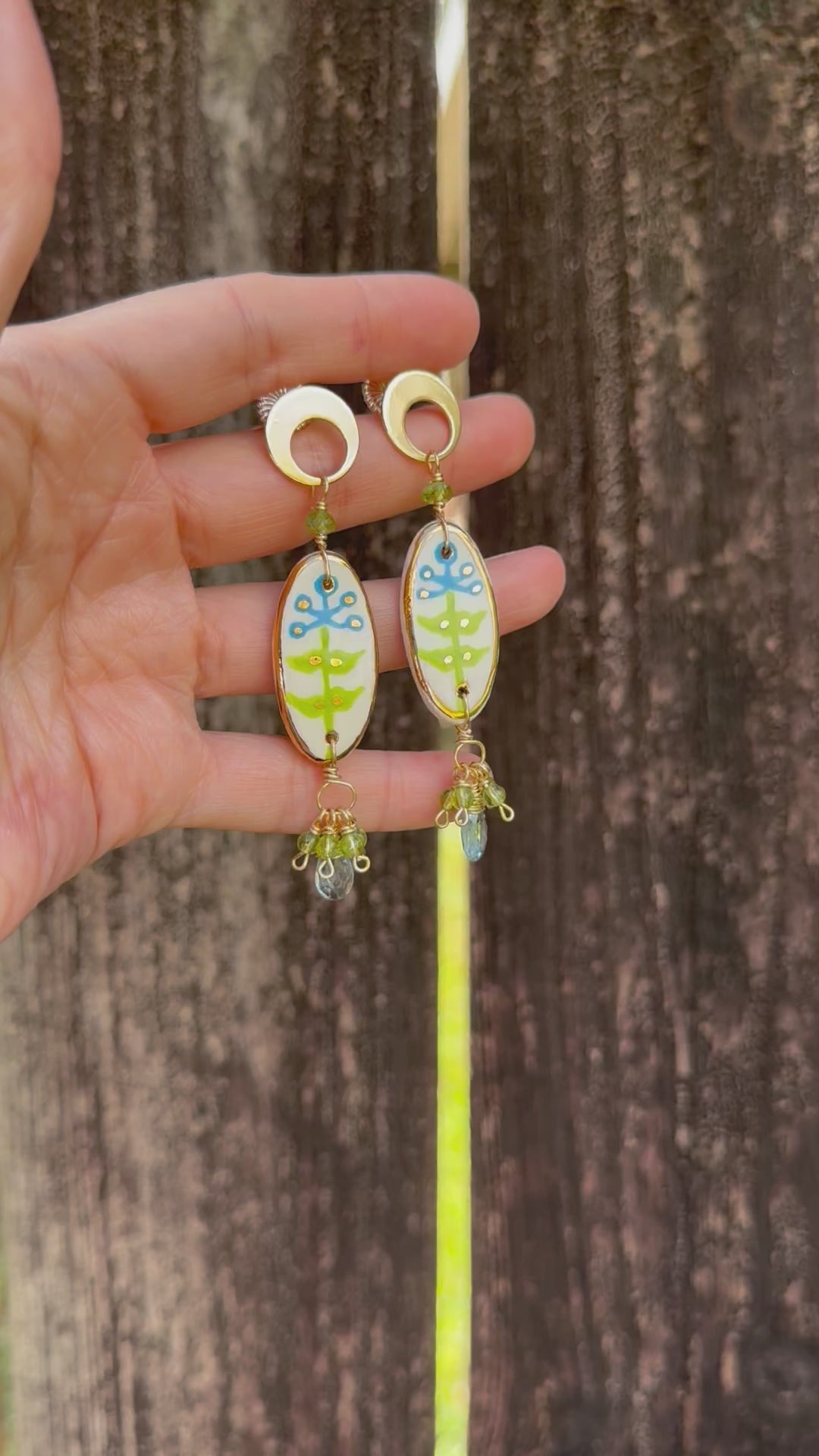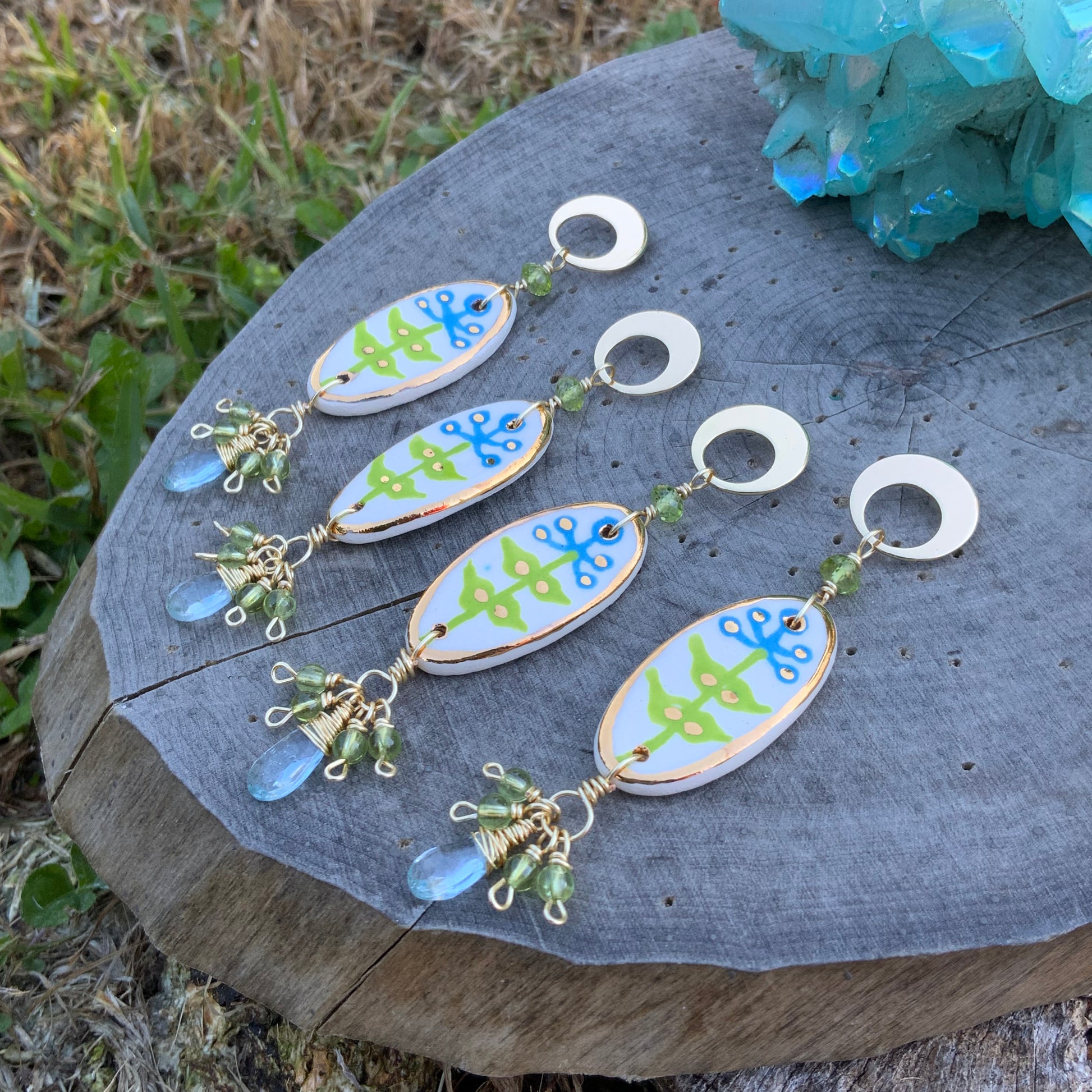 These modern ceramic Blue Bonnet earrings are a dream! Two clusters of precious blue topaz and peridot gems are encircled by bright gold luster, evoking the beauty of a summertime meadow. So bonny you'll be sure to turn heads!