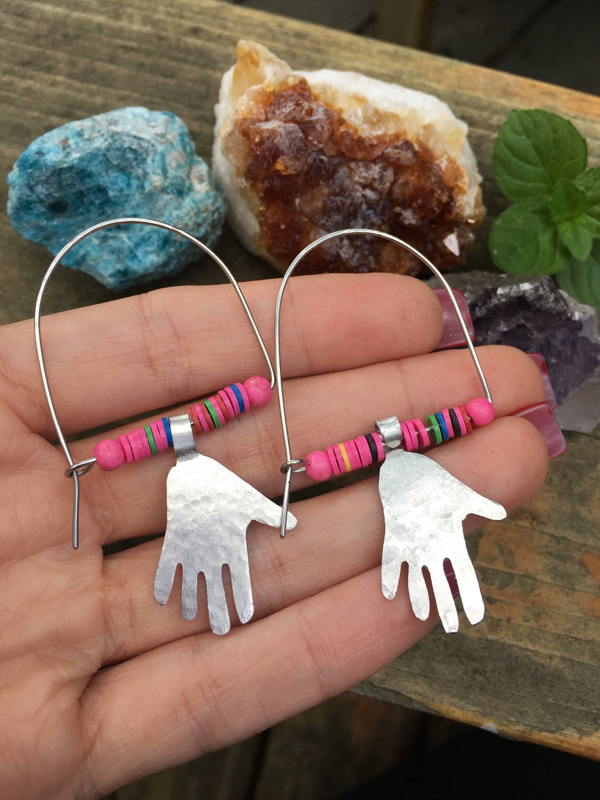 Modern hoop earrings with little hands, modern hoop earrings with pink vinyl beads
