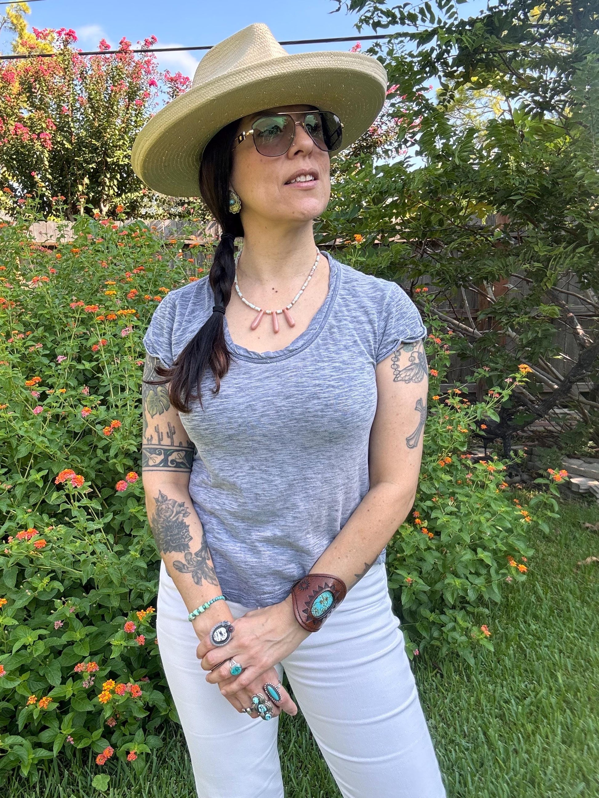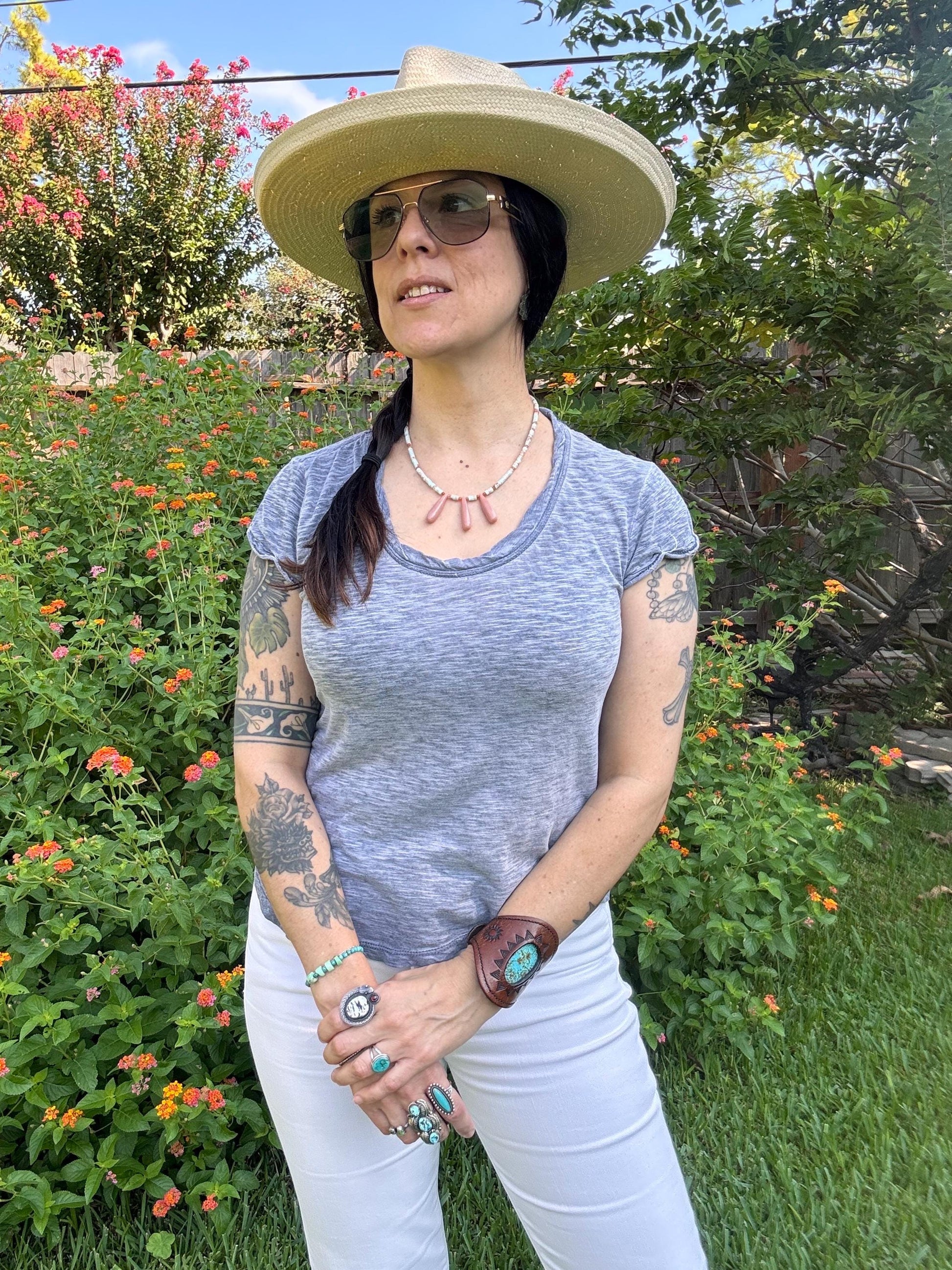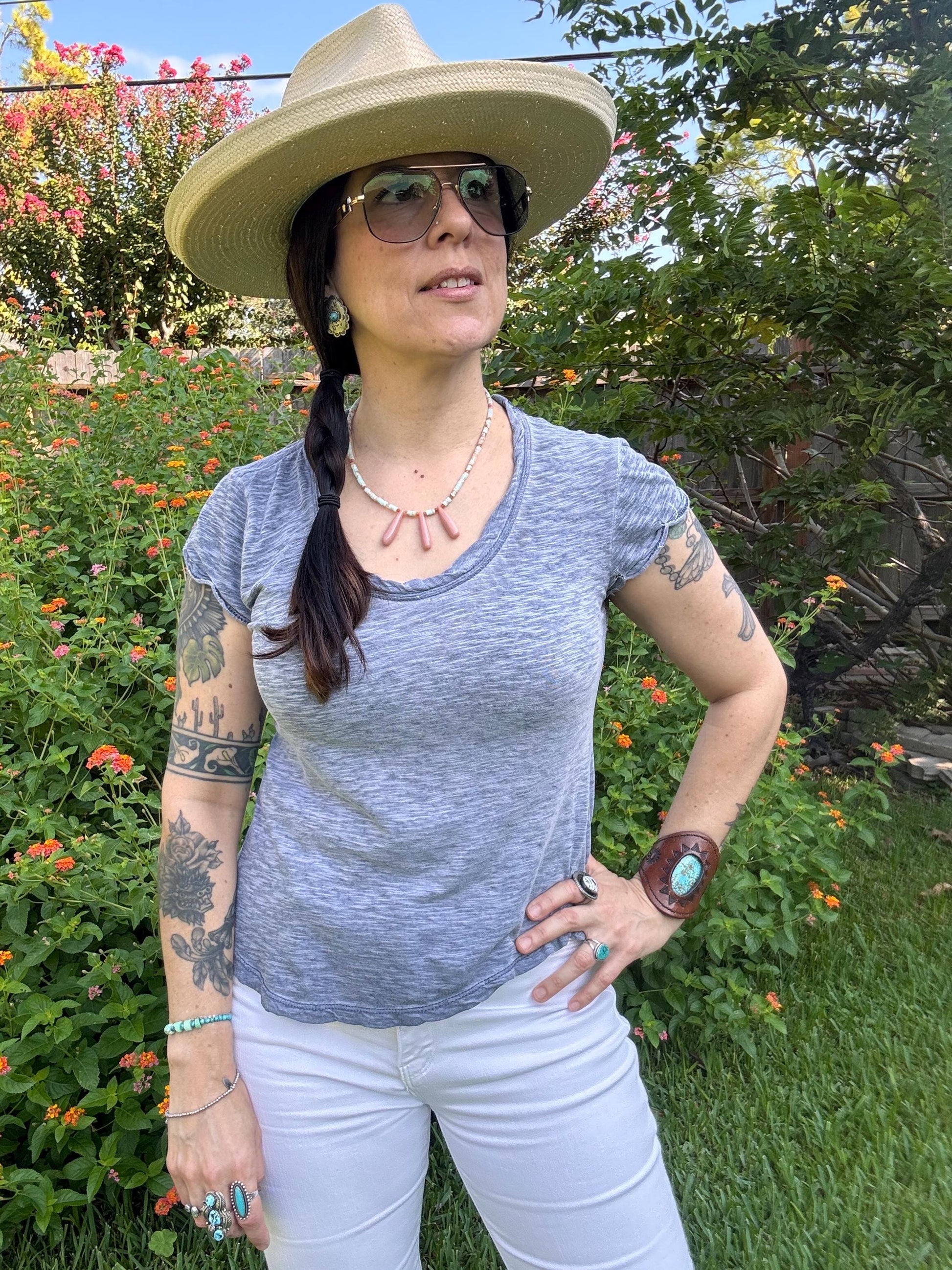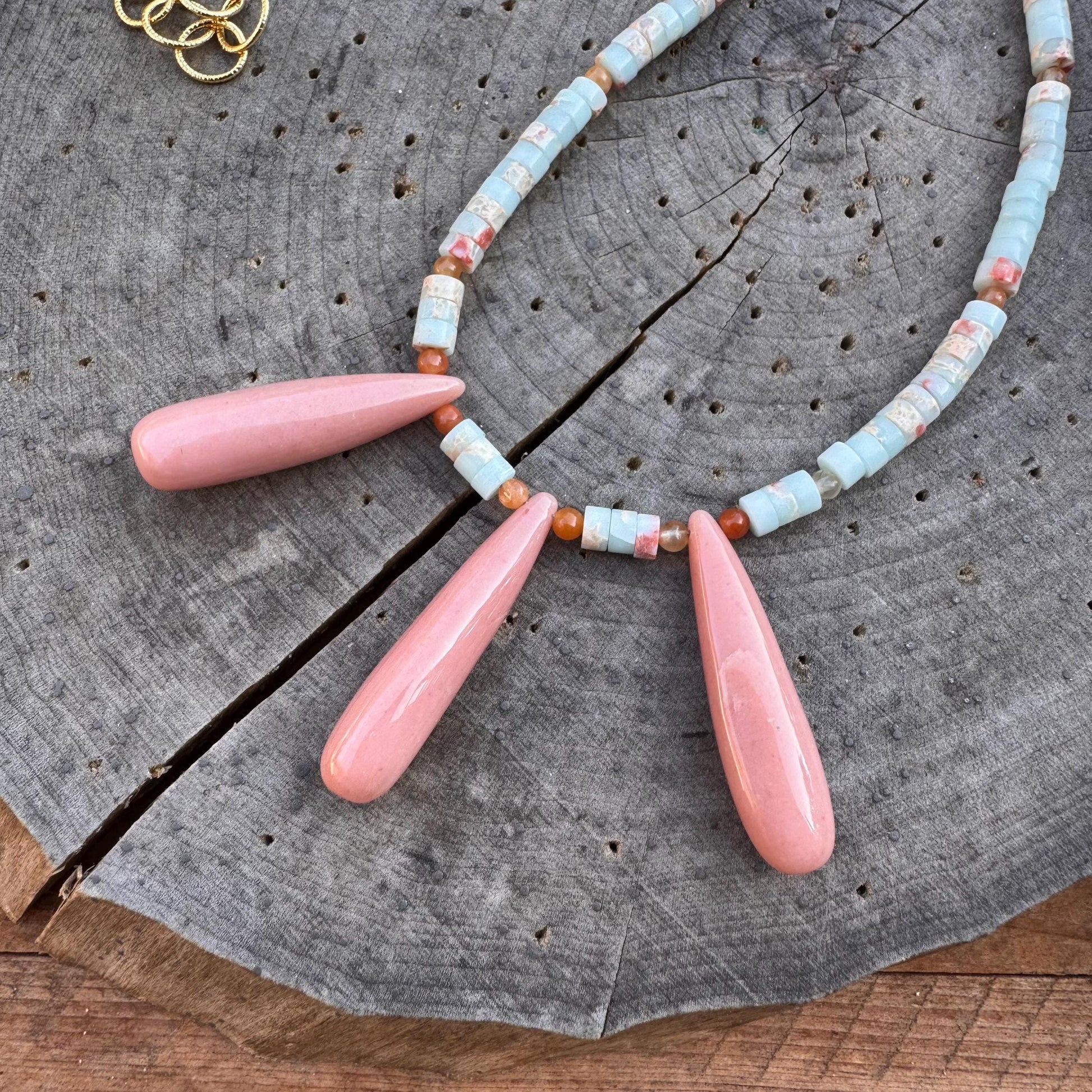 Dive into dreamy elegance with these enchanting pink opal drops paired with soft blue aquaterra jasper beads. Each stone tells its own story—the gentle blush tones of pink opal whisper calm and compassion, while the soothing blue jasper brings a touch of serene sophistication. Strung together with warm gold accents that catch the light beautifully, this necklace is your ticket to effortless, whimsical style. Perfect for layering or wearing solo, it's the kind of piece that makes you smile every time you catch your reflection. Let your inner magic shine.