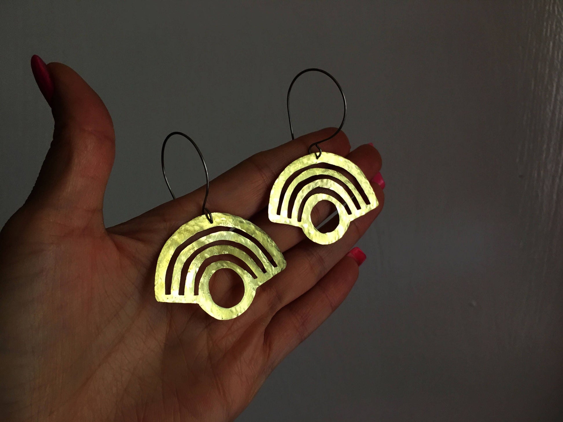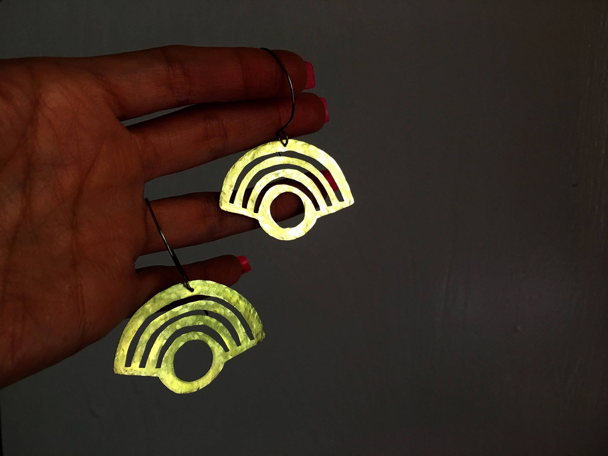 Hand-cut rainbow arches dangle gracefully from delicate stainless steel hoops, creating movement with every turn of your head. These lightweight earrings blend artistic flair with everyday wearability—perfect for adding a pop of color to your look without the weight. Each arch is uniquely crafted, making them a conversation starter that feels both modern and playful.