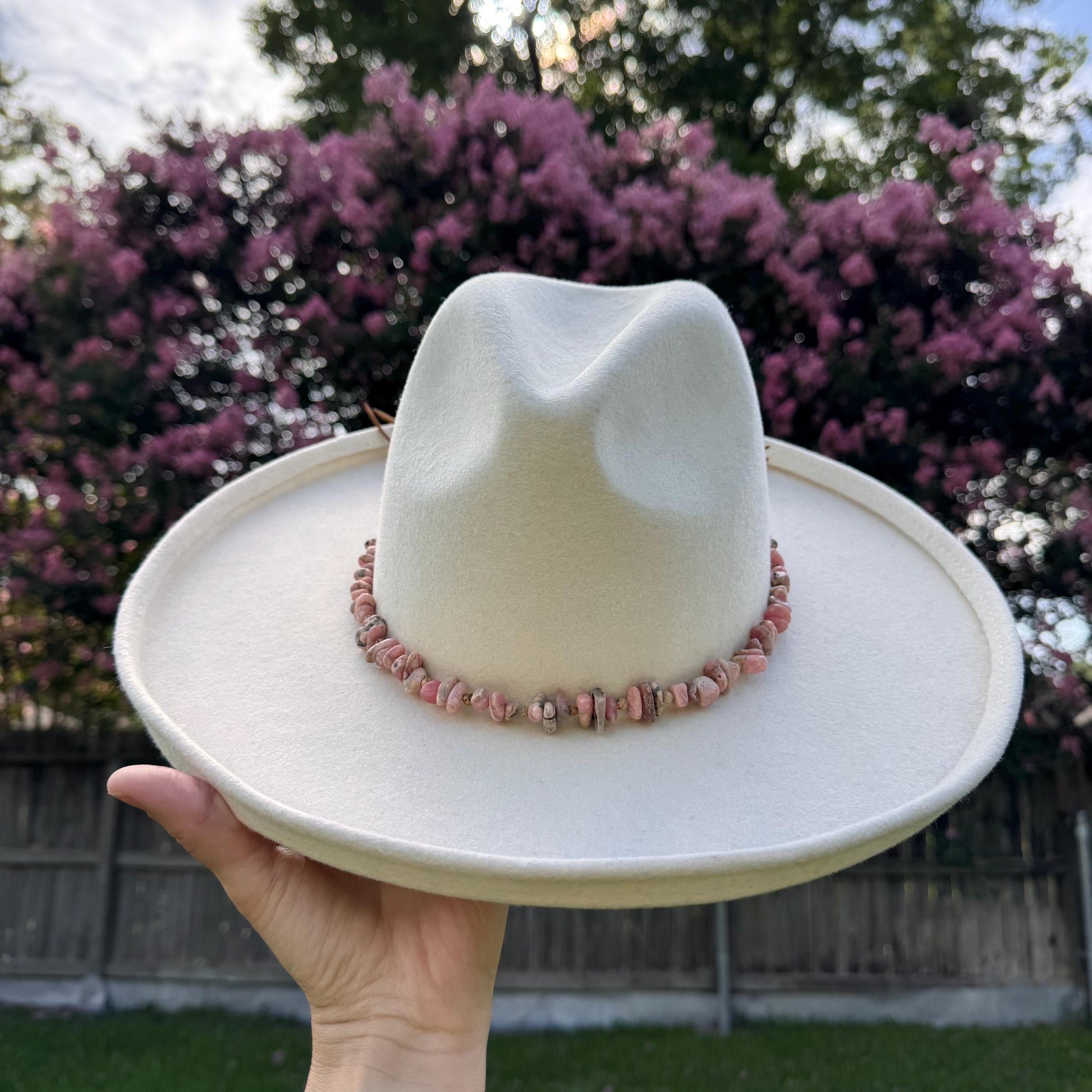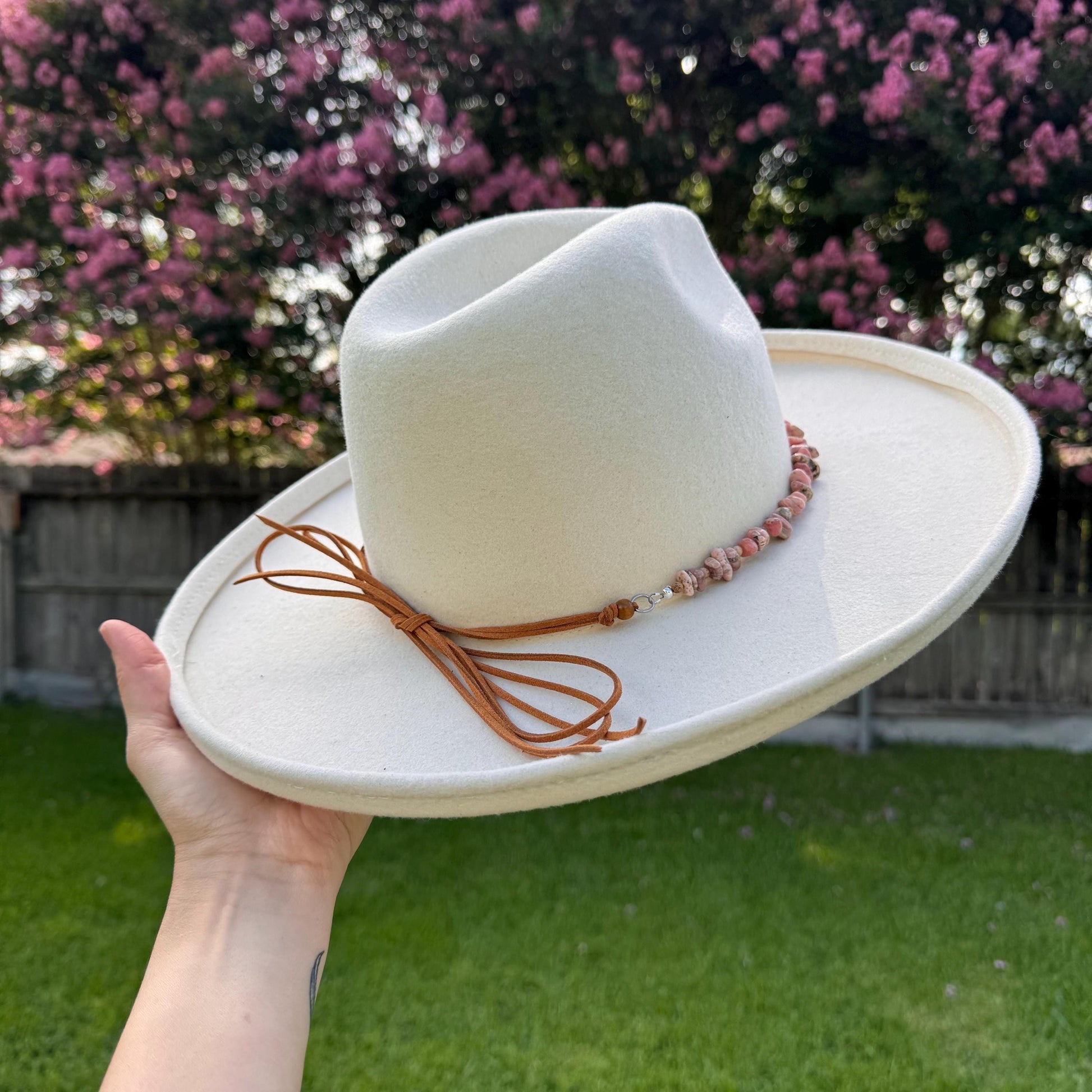 Transform any hat into a statement piece with this delightful hat band! Featuring gorgeous rhodochrosite's rosy hues paired with earthy picture jasper, this accessory wraps your favorite headwear in natural beauty. The adjustable vegan suede cord fits snugly on caps, fedoras, sun hats, and beyond—no matter your style. Crafted for gemstone enthusiasts who refuse to compromise on sustainability, this rustic treasure brings bohemian flair to your everyday adventures.