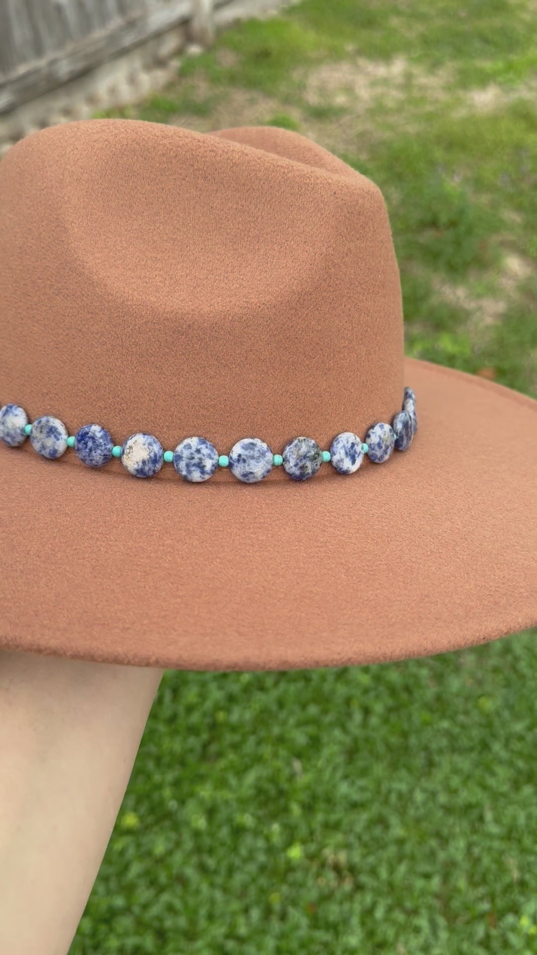Introducing: the Sodalite Hatband - a unique and playful addition to any hat! This vibrant blue gemstone hat band brings a touch of bohemian charm to your accessories. Stand out from the crowd with this quirky and fun addition to your wardrobe.