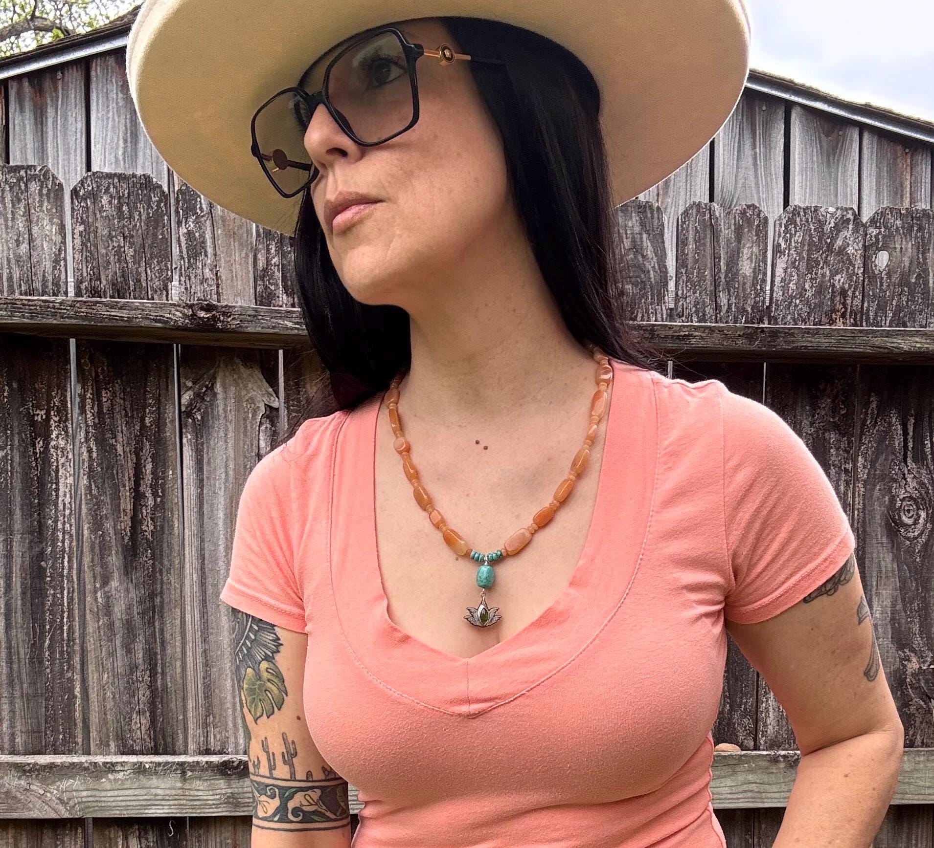 Rock your desert aesthetic with this playful sterling silver agave charm necklace, handcrafted with love. Featuring a striking agave pendant paired with green garnet, peach aventurine, and turquoise stones, it's the perfect accessory for anyone who adores arid landscapes and botanical vibes. This piece brings together artisan craftsmanship and natural gemstone beauty—ideal for layering or wearing solo. Let your love for the desert shine with every wear.