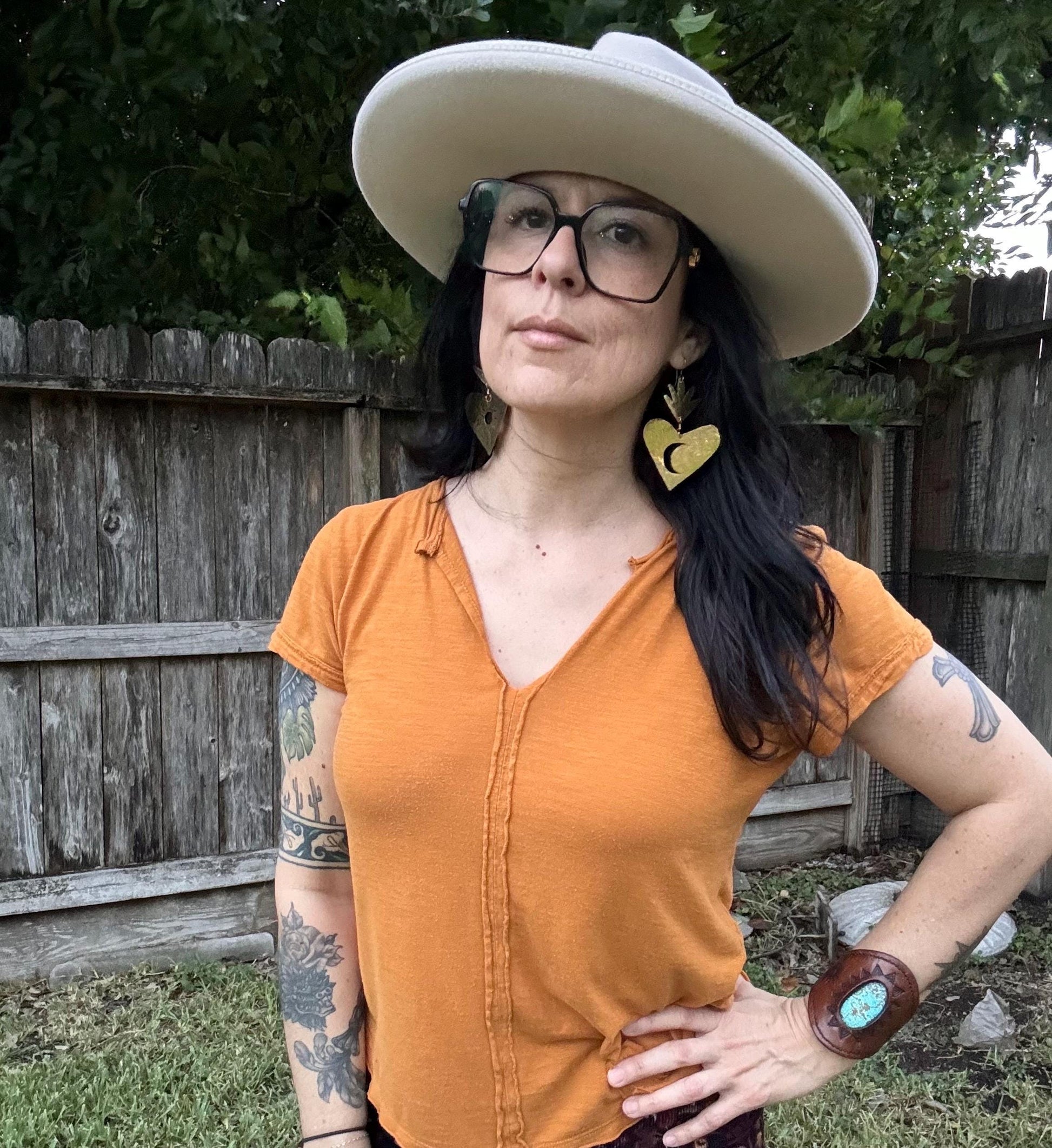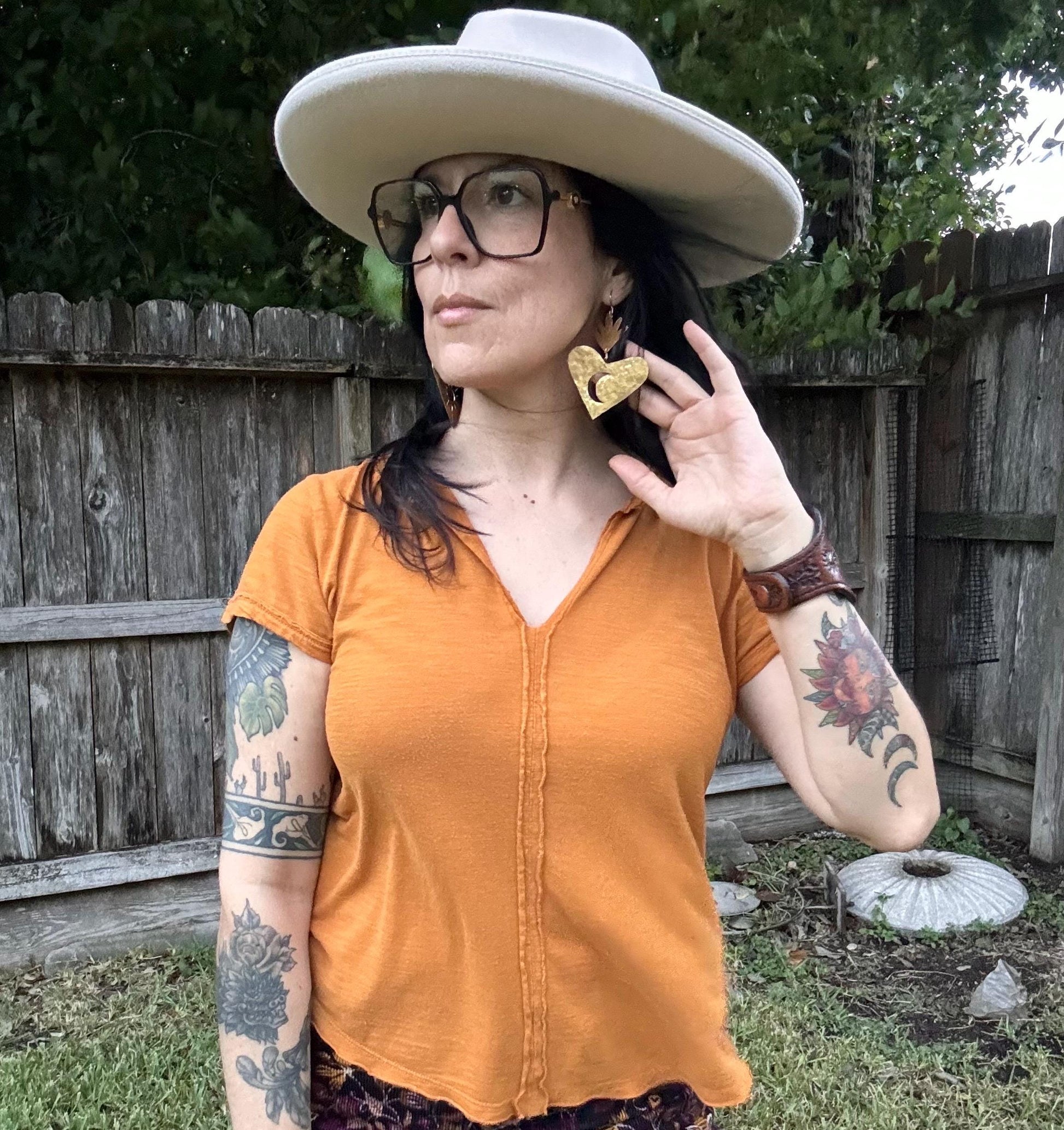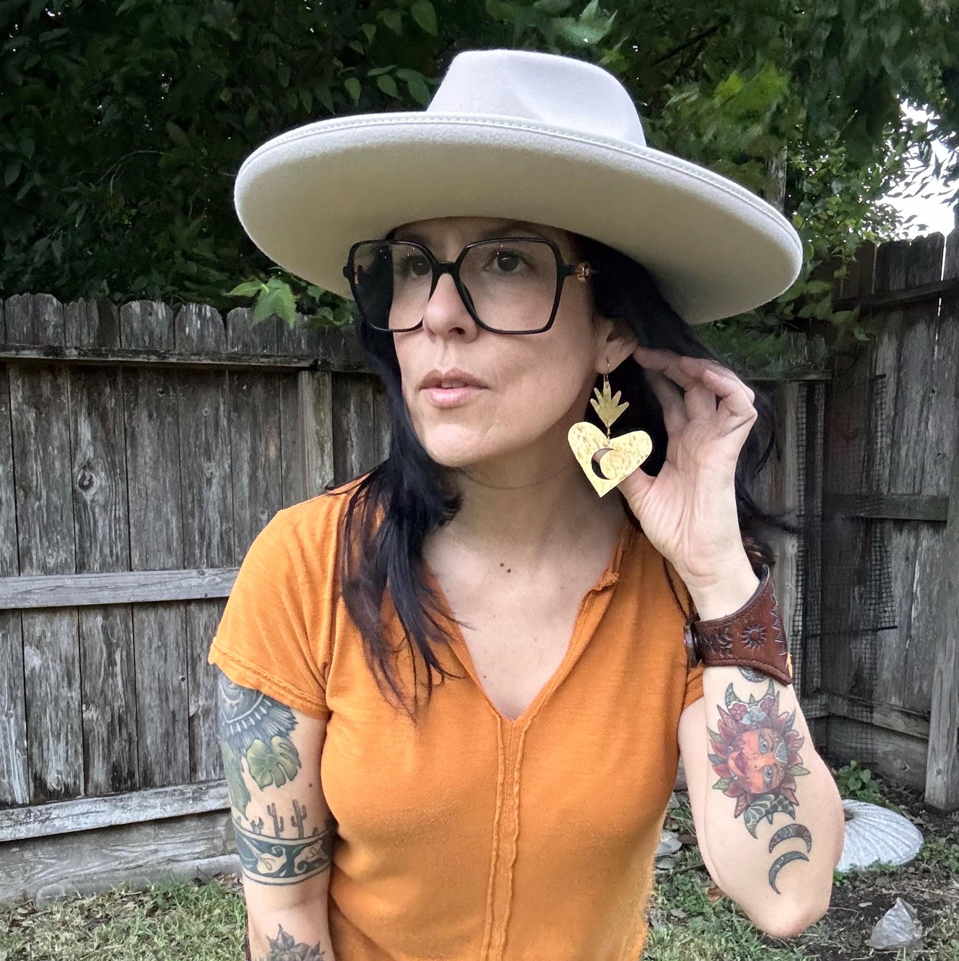 These show-stopping sacred heart earrings are seriously impossible to miss! Hand-cut with meticulous detail, each pair features a celestial sun and moon design that catches the light beautifully. Available in your choice of warm brass, rich copper, or lightweight aluminum, these XL beauties make a bold statement whether you're channeling spiritual vibes or just want jewelry that demands attention. Perfect for those who believe bigger is better and aren't afraid to let their hearts shine.